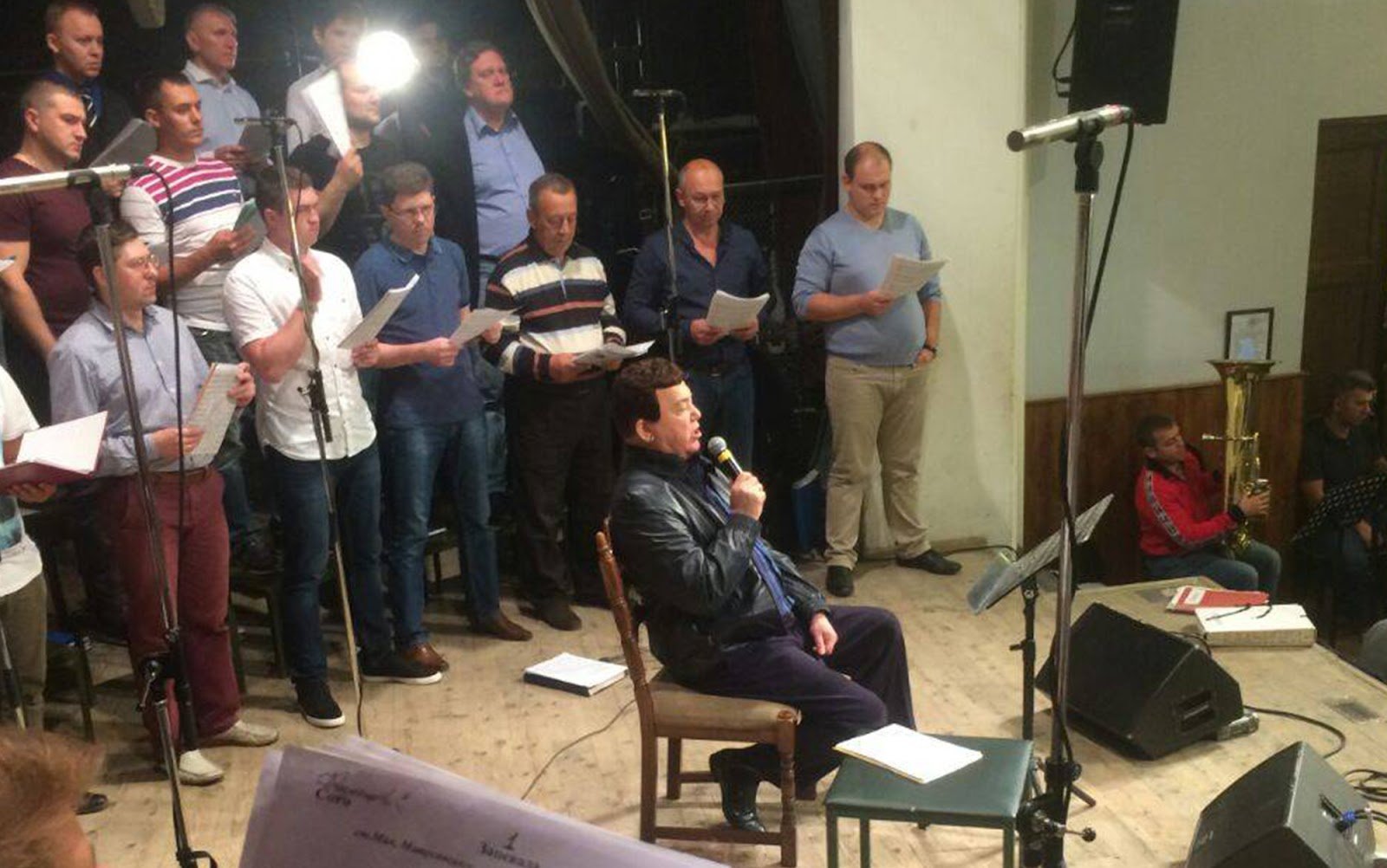 Тифлокомментарий: цветная фотография. Репетиция хора в актовом зале. Иосиф Кобзон сидит на стуле в центре сцены, поет в микрофон. На нем темные брюки и куртка. За ним в три ряда полукругом выстроились хористы в повседневной одежде, держат перед собой ноты. Во втором ряду стоит Олег, сложив руки за спиной.
