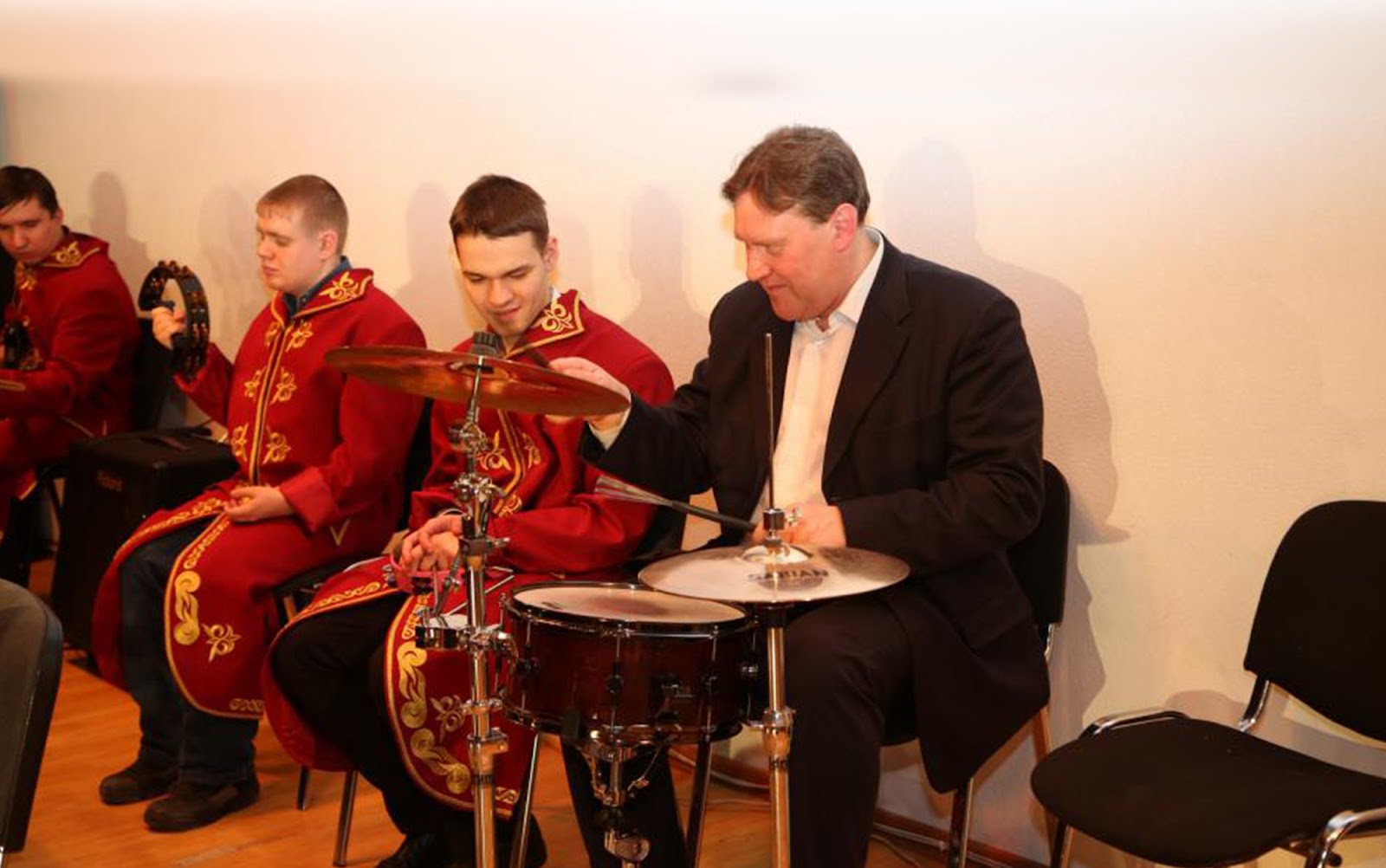 Тифлокомментарий: цветная фотография. Олег и трое юношей сидят в ряд у светлой стены. Олег в черном костюме и белой рубашке играет на ударной установке. Юноши в красных кафтанах с золотыми узорами играют на бубнах.
