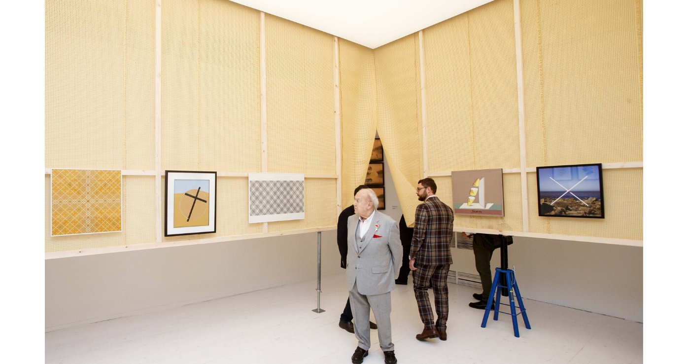 Тифлокомментарий: цветная фотография. Трое мужчин, среди которых пожилой мужчина в сером костюме-тройке и медалью «Золотая звезда» на лацкане, стоят в ярко освещенном выставочном зале со светлыми стенами. По периметру на небольшом расстоянии от стен с потолка свисают ротанговые панели, на которых в один ряд вывешены рисунки и фотографии.