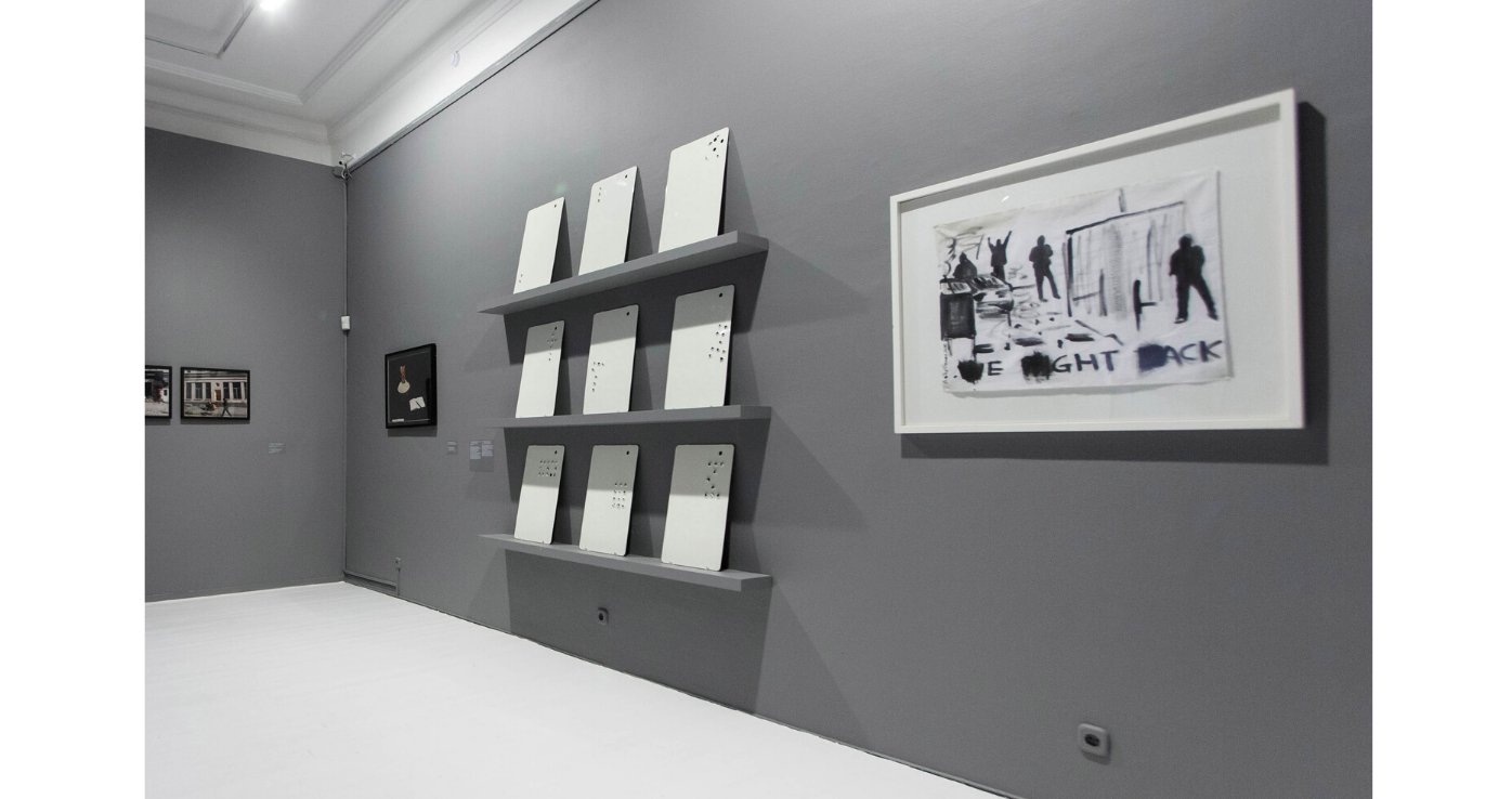 Тифлокомментарий: цветная фотография. Выставочный зал с серыми стенами и белым полом. На трех полках стоят по три белые металлические пластины с закругленными краями размера А3. На каждой пластине сделаны дырочки. На стенах висят картины, фотографии.