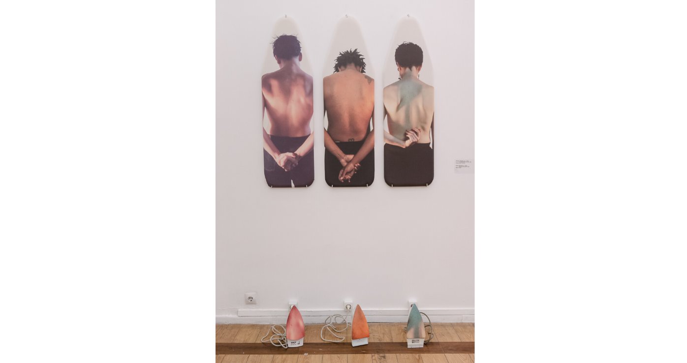 Тифлокомментарий: цветная фотография. На белой стене в ряд висят три гладильные доски. На них изображены женщины с обнаженными спинами, с разным цветом кожи. Они стоят, склонив головы с короткими темными волосами. Руки заведены назад. Под досками на полу — три включенных в розетку утюга, подошвы которых такого же цвета, что и кожа фигур.