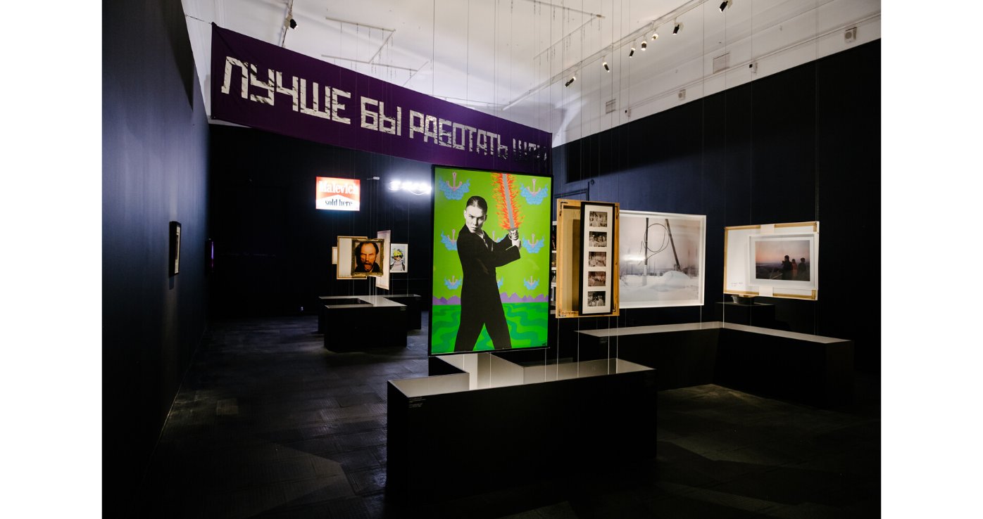 Тифлокомментарий: цветная фотография. Выставочный зал с черными стенами и полом. На дальней стене ярко светит прожектор. Под потолком растянут транспарант с надписью: «Лучше бы работать шли». По залу хаотично расставлены подиумы, похожие на фигуры из тетриса. Над ними на металлических тросах подвешены фотографии и картины разных стилей и размеров. На переднем плане фотоколлаж: на зеленом фоне мужчина в черном костюме обеими руками держит меч джедая, готовится нанести удар.