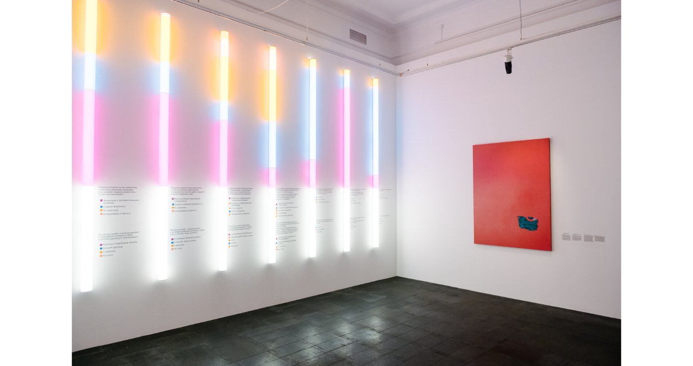 Тифлокомментарий: цветная фотография. Выставочный зал с белыми стенами и черным резиновым полом. На левой стене в ряд висят цветные люминесцентные трубчатые лампы. На правой стене висит картина, залитая красным цветом, лишь в правом нижнем углу нарисованы волны и часть спасательного круга.