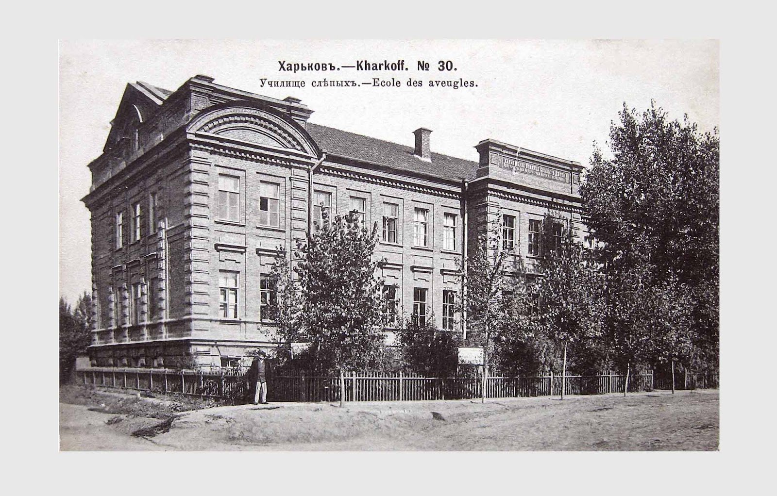 Тифлокомментарий: черно-белая открытка с изображением двухэтажного здания эпохи классицизма. Здание стоит на высоком цоколе, фасад прорезан частым рядом окон и дополнен двумя выступами. Над одним из них надпись с дореволюционной орфографией: «Харьковское училище для слепых детей». Сверху надпись по-русски и по-французски «Харьков. Училище слепых».