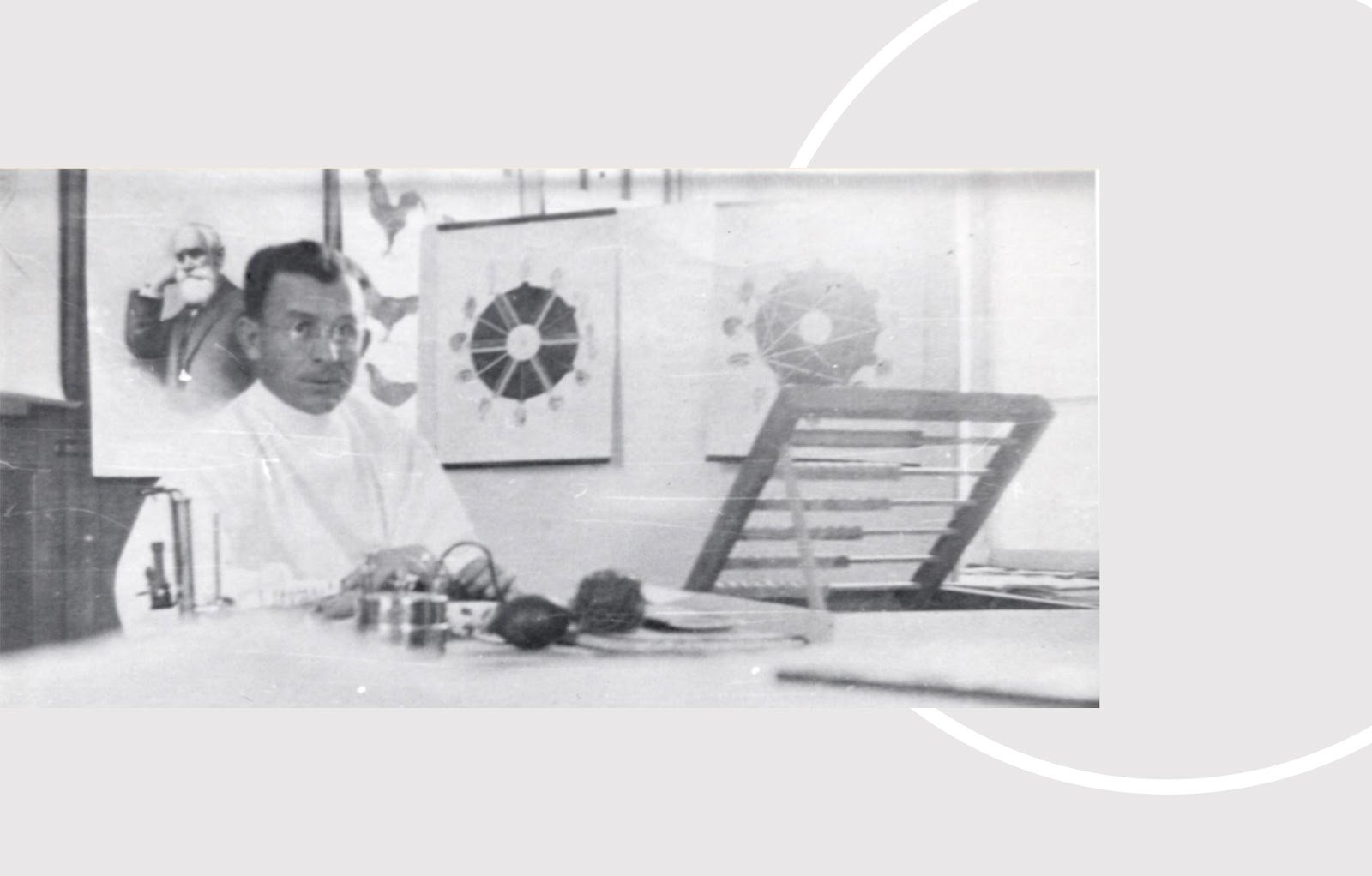 Тифлокомментарий: светло-серый фон с абстрактными узорами. Слева черно-белая фотография врача в кабинете, это профессор Иван Афанасьевич Соколянский, советский дефектолог, специалист в области тифло- и сурдопедагогики, мужчина средних лет в белом халате и круглых очках в тонкой оправе. У него темные густые волосы с симметричными залысинами на лбу. Он сидит за столом, на котором стоят счеты и разложены инструменты. На стенах круговые диаграммы и графический портрет И.П. Павлова: седой академик сидит вполоборота, опершись на правую руку.