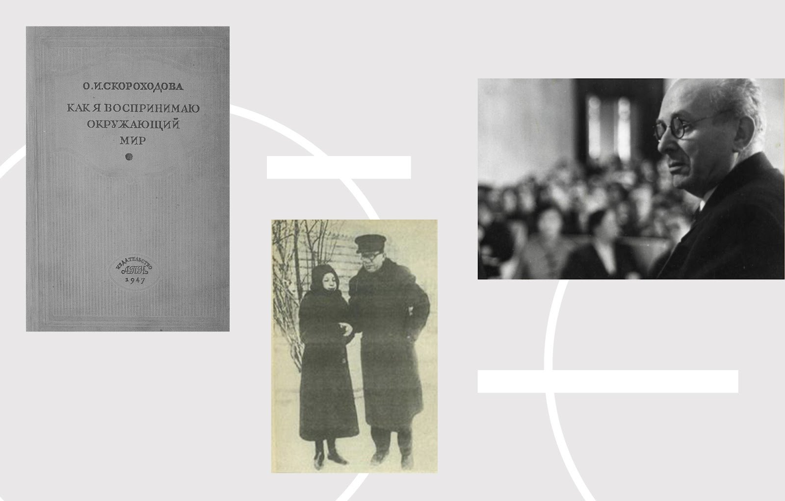 Тифлокомментарий: черно-белый фотоколлаж. Три фотографии на светло-сером фоне с абстрактными узорами. Слева вверху – обложка книги Скороходовой «Как я воспринимаю мир» с виньеткой с именем автора и названием и надписью внизу: “Издательство АПН, 1947”. В центре снизу – пожелтевшая фотография: на фоне зимнего пейзажа мужчина в круглых очках, картузе и пальто держит под руку девушку в пальто, сапожках и шапке-шлеме. Это профессор Иван Афанасьевич Соколянский и Ольга Скороходова. В правом верхнем углу погрудный фотопортрет Соколянского в круглых очках, темном пиджаке и белой рубашке: у него высокий покатый лоб, прямой крупный нос, крупные губы, глубокие морщины у рта. За ним – размытое изображение зрительного зала со слушателями.