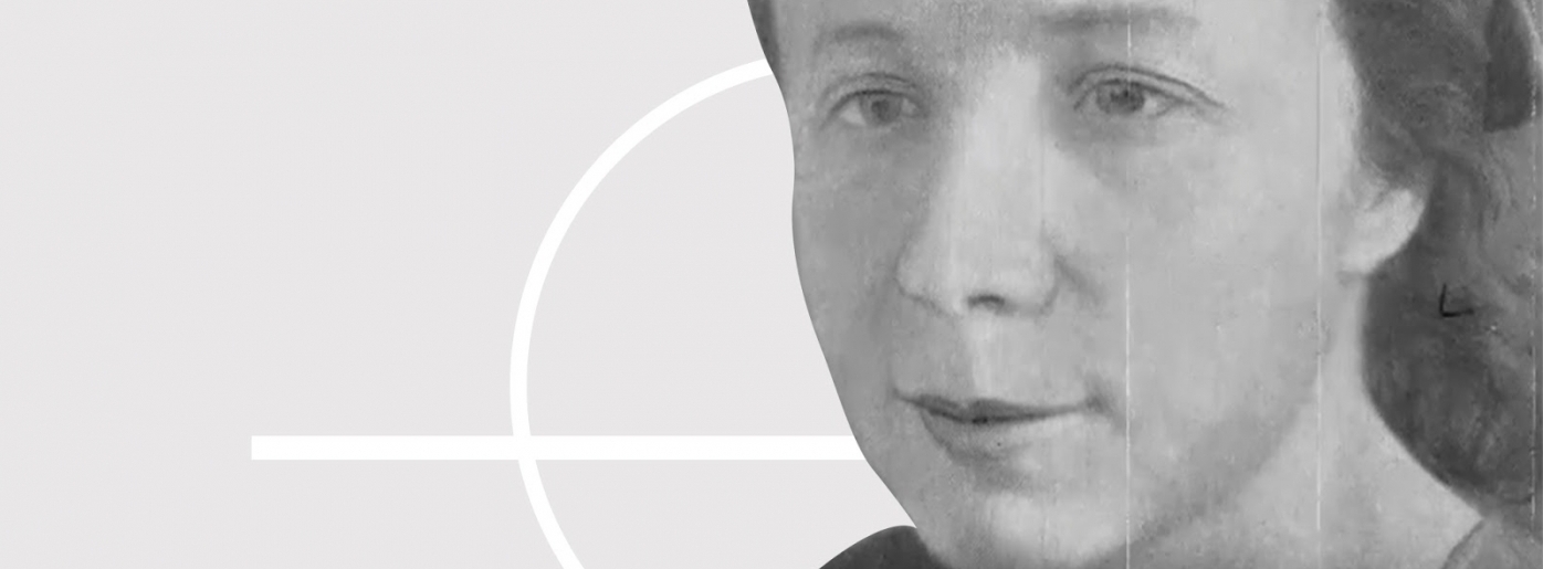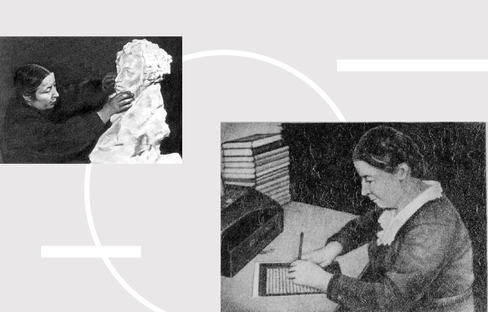 Тифлокомментарий: черно-белый фотоколлаж. Два изображения на светло-сером фоне с абстрактными узорами. На фотографии вверху слева Ольга Скороходова в черной одежде, с темными волосами, разделенными на прямой пробор, тактильно осматривает слепок бюста Пушкина. На изображении справа внизу она же с забранными назад волосами в платье с белым кружевным воротником сидит за столом и делает записи с помощью прибора для письма по Брайлю и грифеля. На столе небольшое настольное бюро и сложенные ровной стопкой книги.