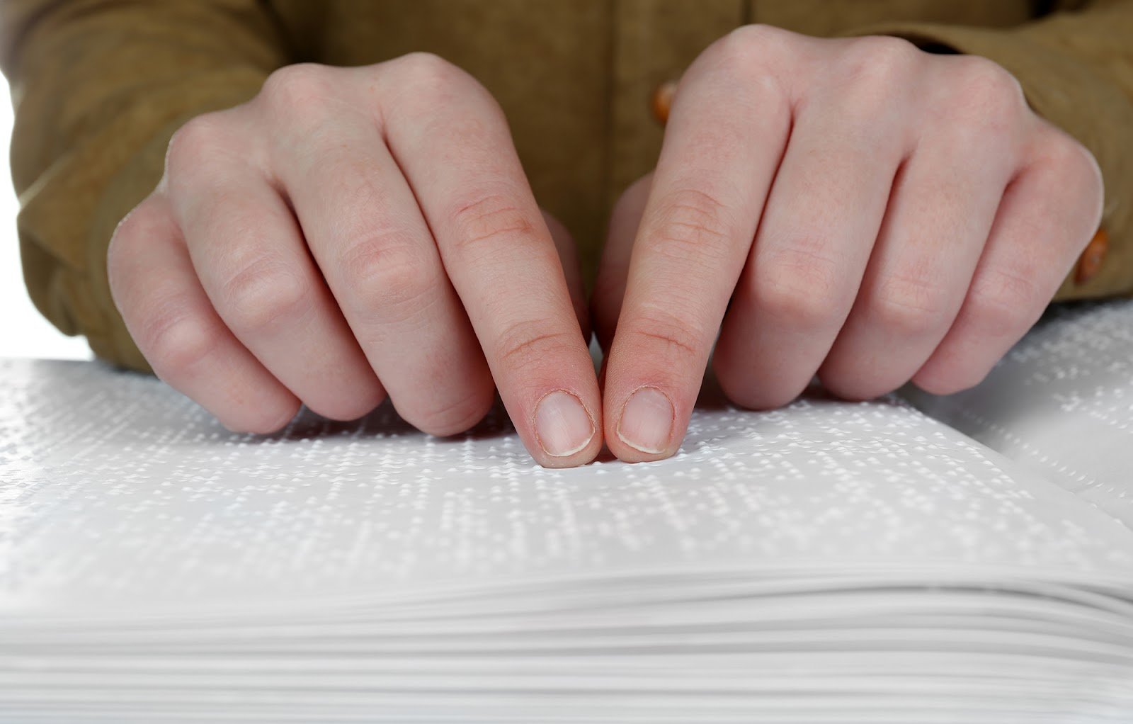 Тифлокомментарий: указательные пальцы правой и левой рук ведут по книге, напечатанной азбукой Брайля. Остальные пальцы собраны в кулаки.