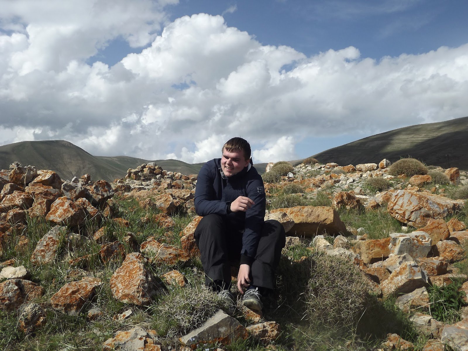 Тифлокомментарий: цветная фотография. Солнечный день в горах. Синее небо с белыми кучевыми облаками. На холме среди серых с рыжими прожилками камней сидит Владимир Васкевич в синей толстовке с капюшоном и темных свободных спортивных штанах и темно-зеленых кедах. Он широко улыбается, левая рука лежит на колене, правой рукой он тянется к правой щиколотке.