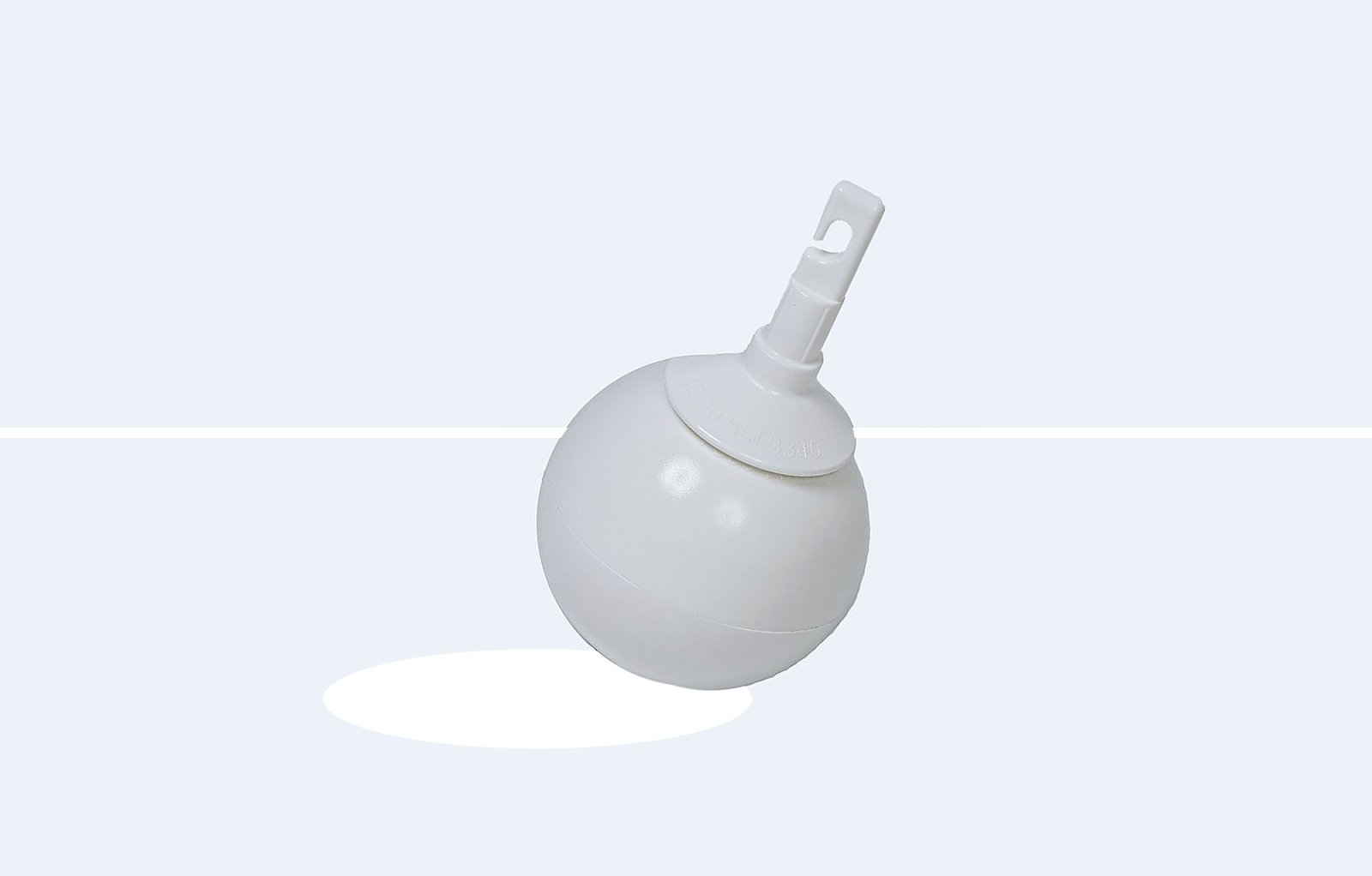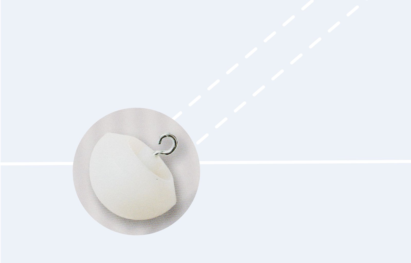 Тифлокомментарий: цветной фотоколлаж. На сером фоне с белой горизонтальной линией по центру представлен сферический вращающийся наконечник белого цвета с пластмассовым креплением-крючком. Наконечник слегка наклонен вправо.