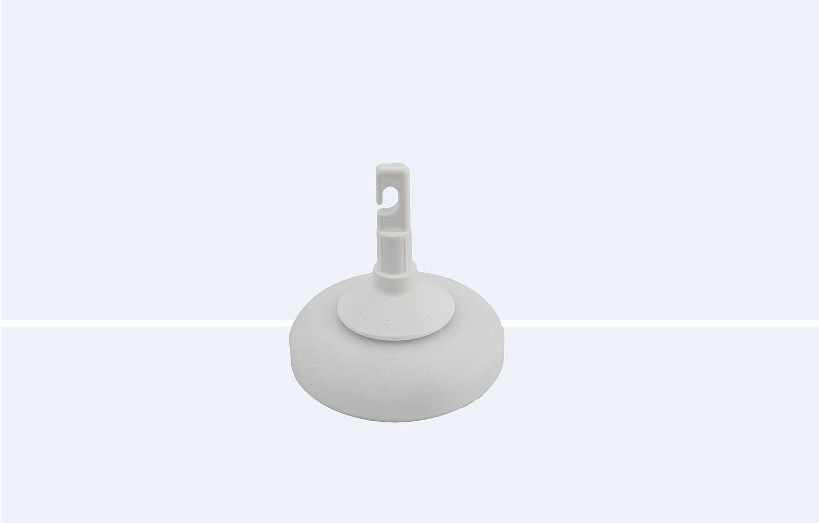 Тифлокомментарий: цветной фотоколлаж. На сером фоне с белой горизонтальной линией по центру представлен белый широкий и слегка сплюснутый сверху и снизу вращающийся наконечник-шайба с пластмассовым креплением-крючком. Наконечник расположен перпендикулярно белой линии.