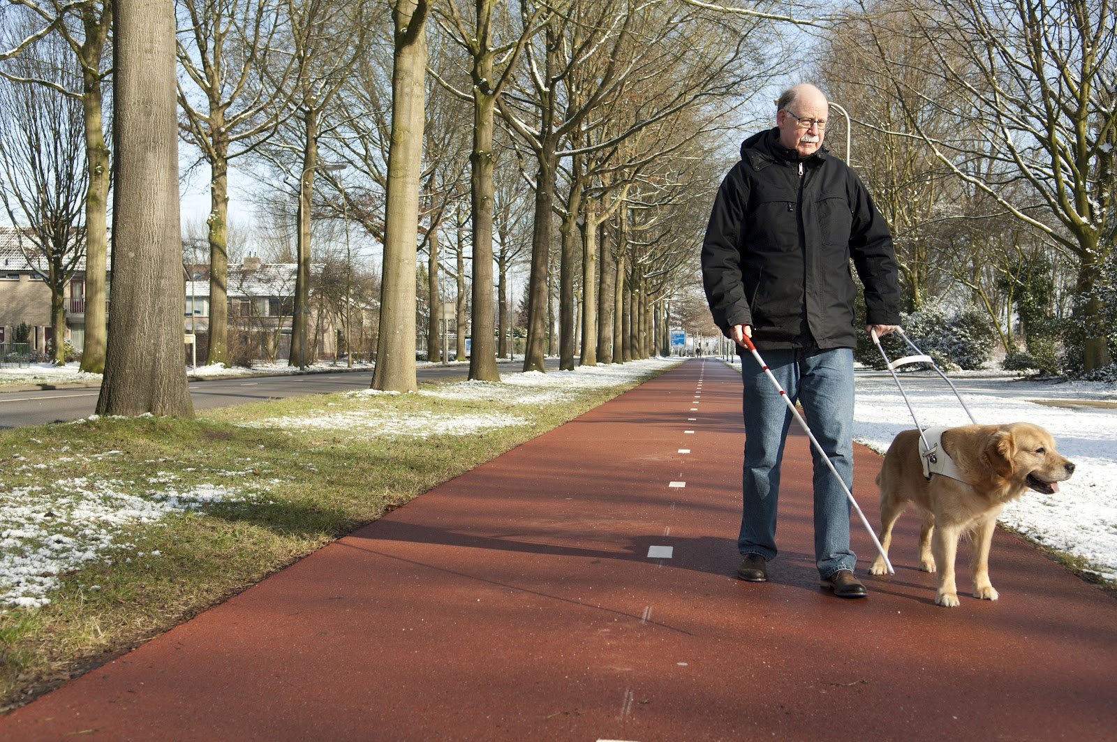 Тифлокомментарий: цветная фотография. Городская улица малоснежной зимой. По пешеходной дорожке красного цвета идет незрячий пожилой мужчина с собакой-проводником. В правой руке он держит белую трость, в левой - металлическую шлейку собаки. Собака - лабрадор со светло-рыжей шерстью.