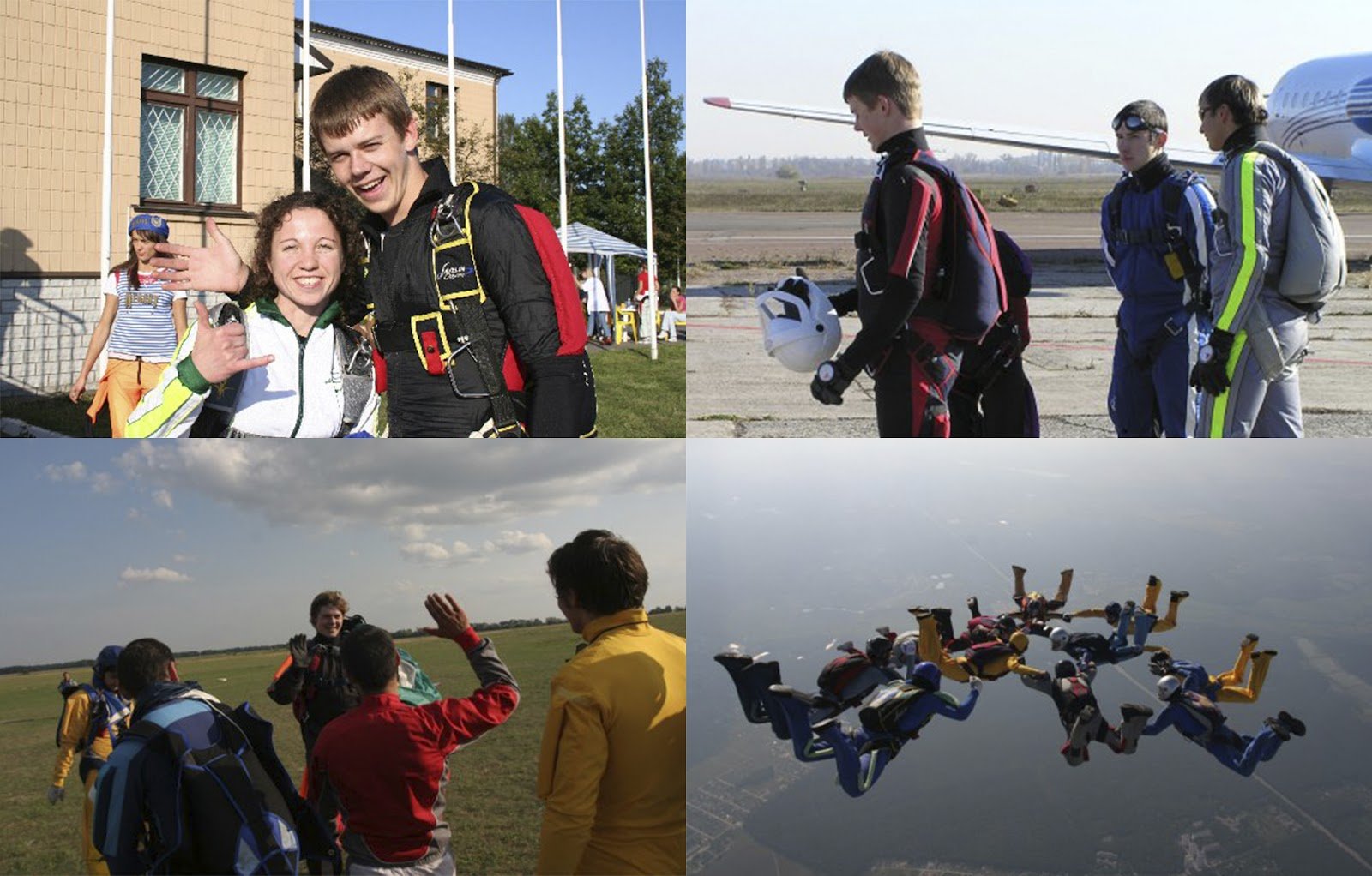 Тифлокомментарий к изображению: коллаж из четырех цветных фотографий. На первой Вячеслав в парашютном костюме с парашютом за плечами приобнимает за плечи девушку с кудрявыми темными волосами на голову ниже Вячеслава. Она приподнимает правую руку: большой палец и мизинец выставлены под прямым углом, остальные собраны в кулак. Девушка тоже в одежде парашютиста. Они стоят при солнечной погоде перед одноэтажным строением. За ними много других людей.