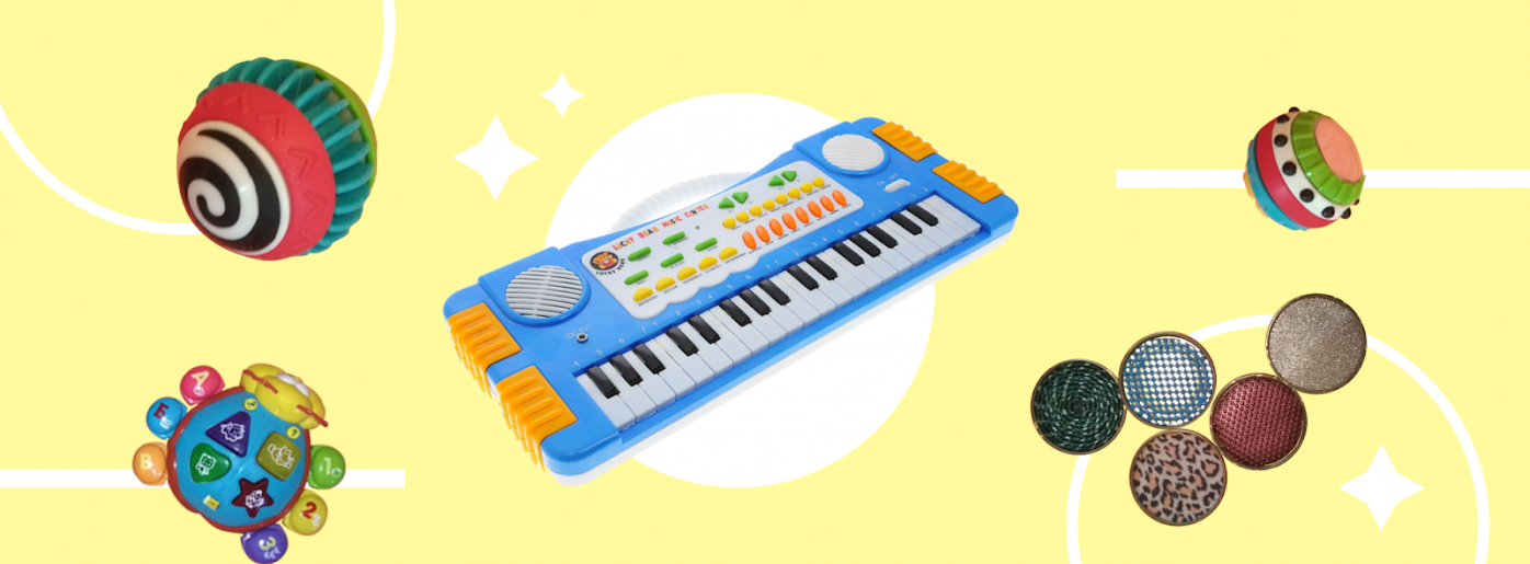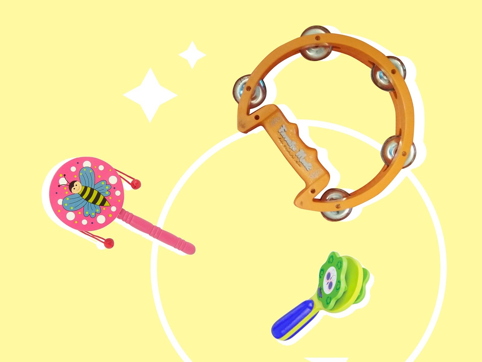 Тифлокомментарий: цветной фотоколлаж. На желтом фоне с белыми абстрактными узорами три детские игрушки. Одна из них - оранжевый бубен с ручкой и металлическими тарелочками. Другая игрушка - трещотка-кастаньеты. Она представляет собой круглую светло-зеленую пластину на синей ручке. К обеим сторонам пластины прикреплены зеленые деревянные детали в форме цветов. Детали в виде цветов прикреплены к пластине неплотно и могут издавать звуки, если игрушку потрясти. Третья игрушка - небольшой розовый барабан на ручке. На боках барабана закреплены две веревочки с бусинами на концах. Если вращать барабан из стороны в сторону, бусины будут ударять по его поверхности и издавать звук. На поверхности барабана изображена пчелка с голубыми крылышками.