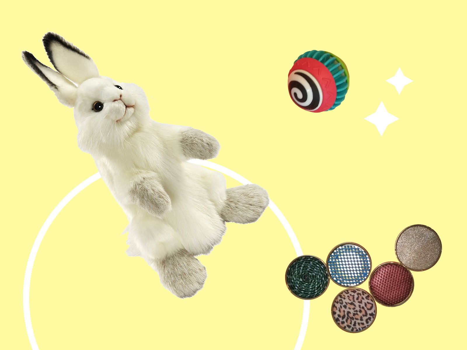 Тифлокомментарий: цветной фотоколлаж. На желтом фоне с белыми абстрактными узорами – мягкая игрушка-заяц, шарик-погремушка и пять круглых крышек, похожих на крышки для стеклянных банок, с разными фактурами поверхностей. Белый заяц стоит на задних лапках, у него черные глаза-бусины, длинные уши с черным краем и белые тонкие проволочки усов. Заяц выглядит реалистично и сделан из меха. Шарик-погремушка состоит из разноцветных крутящихся дисков с рельефными орнаментами: белый с черной спиралью, красный с объемными галочками, зеленый ребристый.