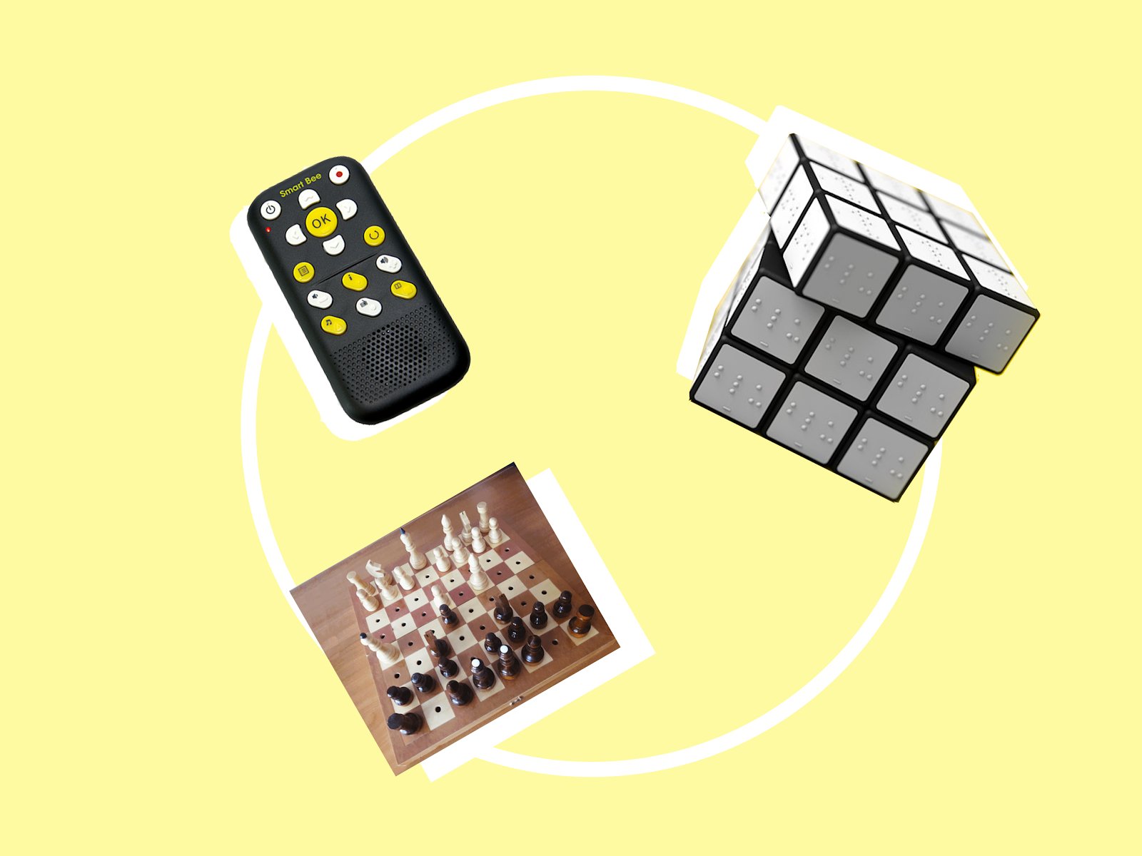 Тифлокомментарий: цветной фотоколлаж. На желтом фоне с белыми абстрактными узорами представлены черный прямоугольный тифлофлешплеер с белыми и желтыми кнопками, кубик Рубика с белыми квадратами с обозначениями шрифтом Брайля и бело-коричневая шахматная доска с отверстиями для закрепления фигур в каждом квадрате и двумя различными по форме комплектами фигур.