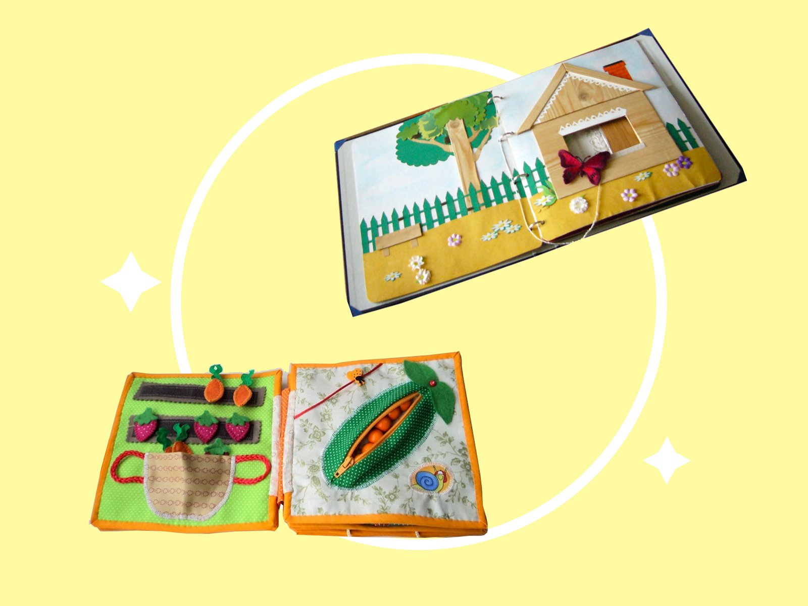 Тифлокомментарий: цветной фотоколлаж. На желтом фоне с белыми абстрактными узорами представлены две тактильные книжки. Слева внизу книга с тканевыми страницами. На левой странице расположен кармашек в виде бежевой корзинки. Над ней на липучке закреплены тканевые ягоды. Некоторые ягоды лежат в корзинке. На правой странице кармашек на молнии в виде зеленого початка кукурузы. Справа вверху книга с перекидными страницами с изображением дома с треугольной крышей и красной трубой, на окне сидит красная объемная бабочка, во дворе – тканевые и бумажные цветы и скамейка, за зеленым забором стоит дерево с бумажной кроной. Дом, дерево и скамейка выполнены из тонкой фанеры.