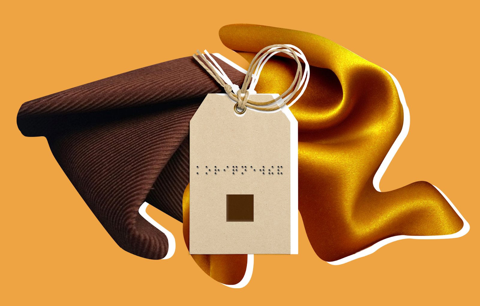 Тифлокомментарий: цветной коллаж. На оранжевом фоне изображены лоскуты коричневой шерстяной ткани в рубчик и золотой блестящей шелковой ткани. Поверх тканей - бежевая бирка на бечевке с квадратным образцом материи и надписью на Брайле. Все предметы обведены по контуру справа белой линией, похожей на тень.