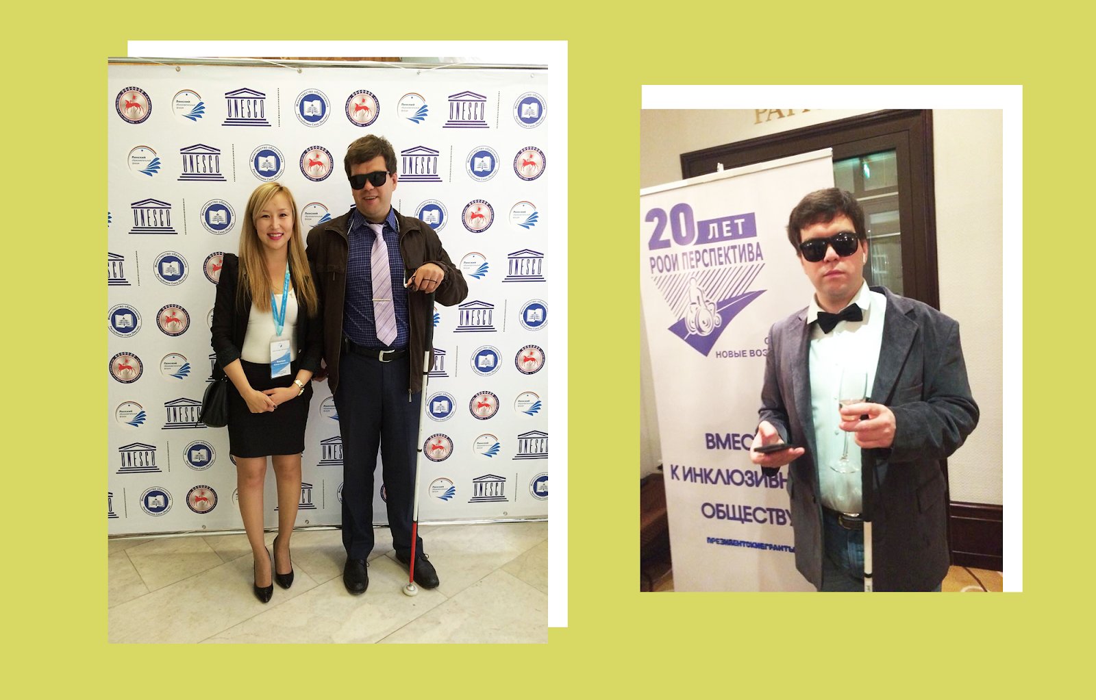 Тифлокомментарий: цветной коллаж из двух фотографий на светло-зеленом фоне. На фотографии слева на фоне белого пресс-вола с логотипами стоят двое: светловолосая изящная девушка на каблуках в черном юбочном костюме и темноволосый крупный мужчина в темных очках и с белой тростью. Это Анатолий Попко. На Анатолии коричневый пиджак, темно-синяя рубашка со светлым галстуком, темные брюки и ботинки. На фотографии справа Анатолий стоит рядом с баннером «РООИ «Перспектива» - 20 лет». На Анатолии синие джинсы, серый пиджак, светло-зеленая рубашка и черный галстук-бабочка. В левой руке у него смартфон, а правой он держит бокал и трость.