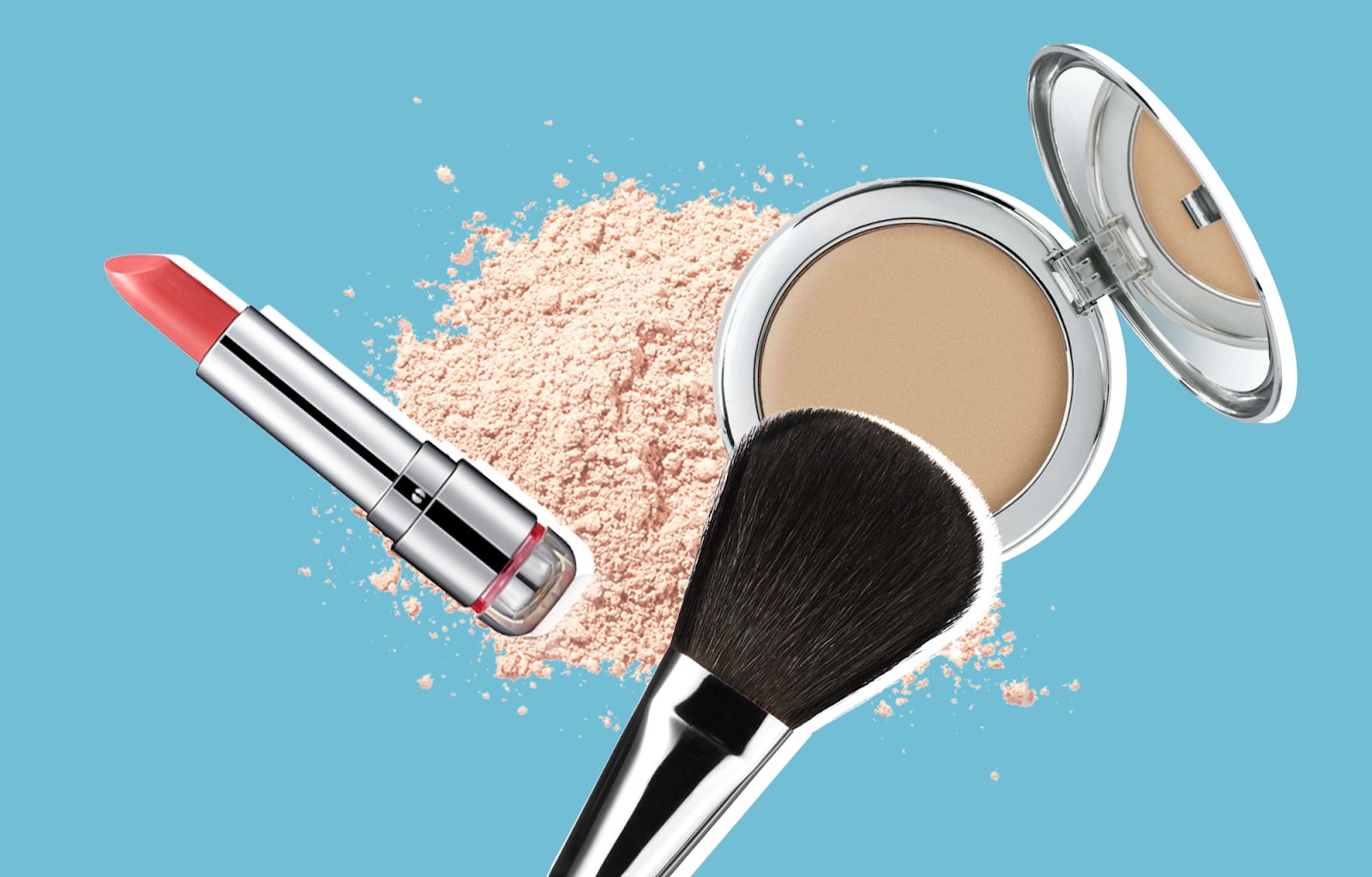 Тифлокомментарий: цветной коллаж на голубом фоне. Бежево-розовые крошки рассыпанной пудры, серебристый металлический тюбик с коралловой губной помадой, круглый серебристый футляр для пудры с зеркалом и кисточка с плоским полукруглым темным ворсом. Все предметы обведены по контуру справа белой линией, похожей на белую тень.