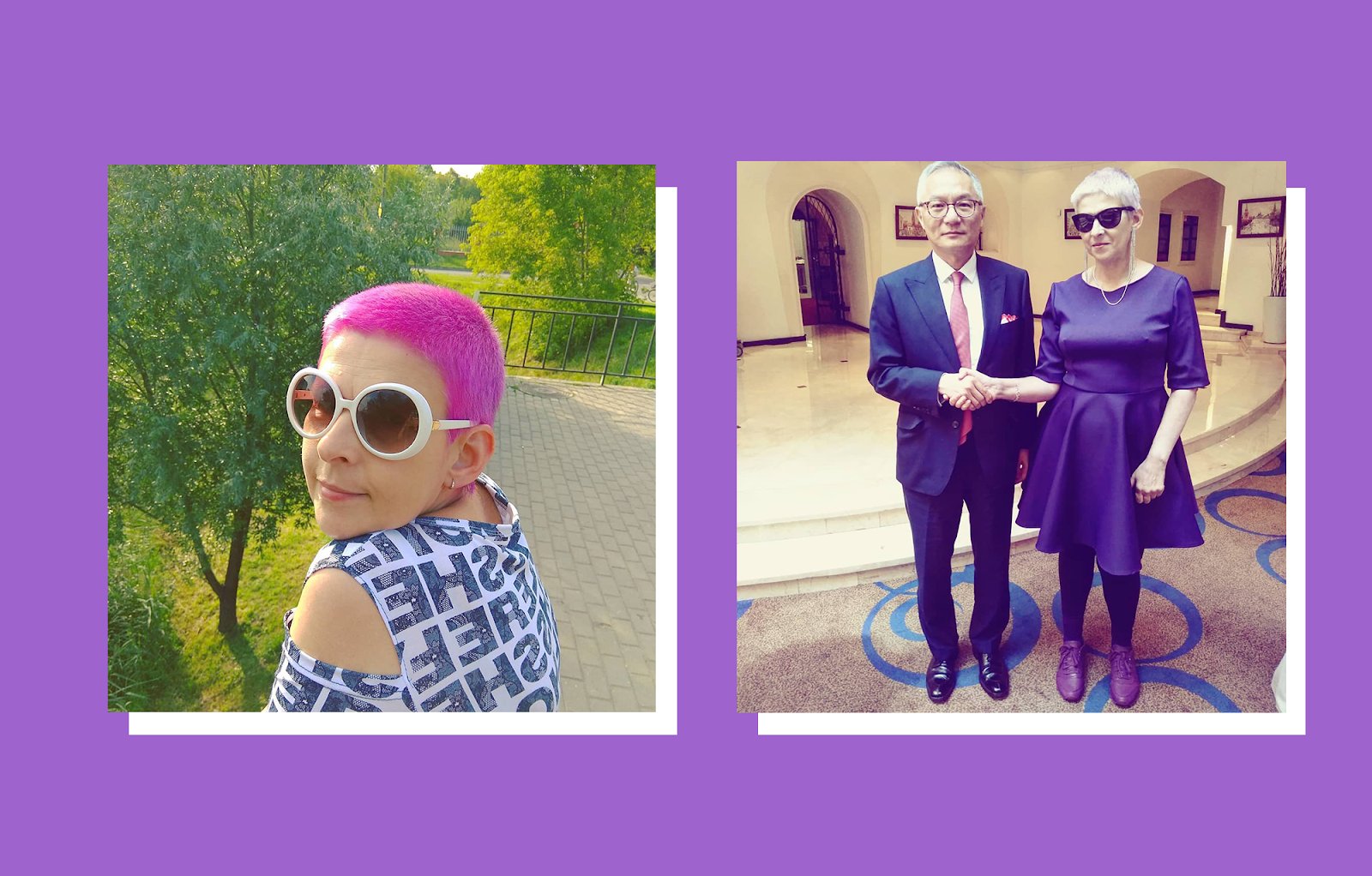 Тифлокомментарий: цветной коллаж из двух фотографий на фиолетовом фоне. На фотографии слева на аллее в парке стоит женщина с коротким ежиком розовых волос, в крупных темных очках с белой оправой, черно-белой кофте с вырезами на плечах. Это Ирина Поволоцкая. Она оборачивается и кокетливо смотрит через плечо. На фотографии справа Ирина Поволоцкая стоит рядом с седым мужчиной в темно-синем костюме. Они пожимают друг другу руки и смотрят прямо перед собой. На Ирине фиолетовое платье с вырезом «лодочкой», рукавом три четверти и пышной юбкой до колена, фиолетовые полуботинки и темно-фиолетовые колготки. На этой фотографии у Ирины светлые короткие волосы и черные очки с цепочкой.