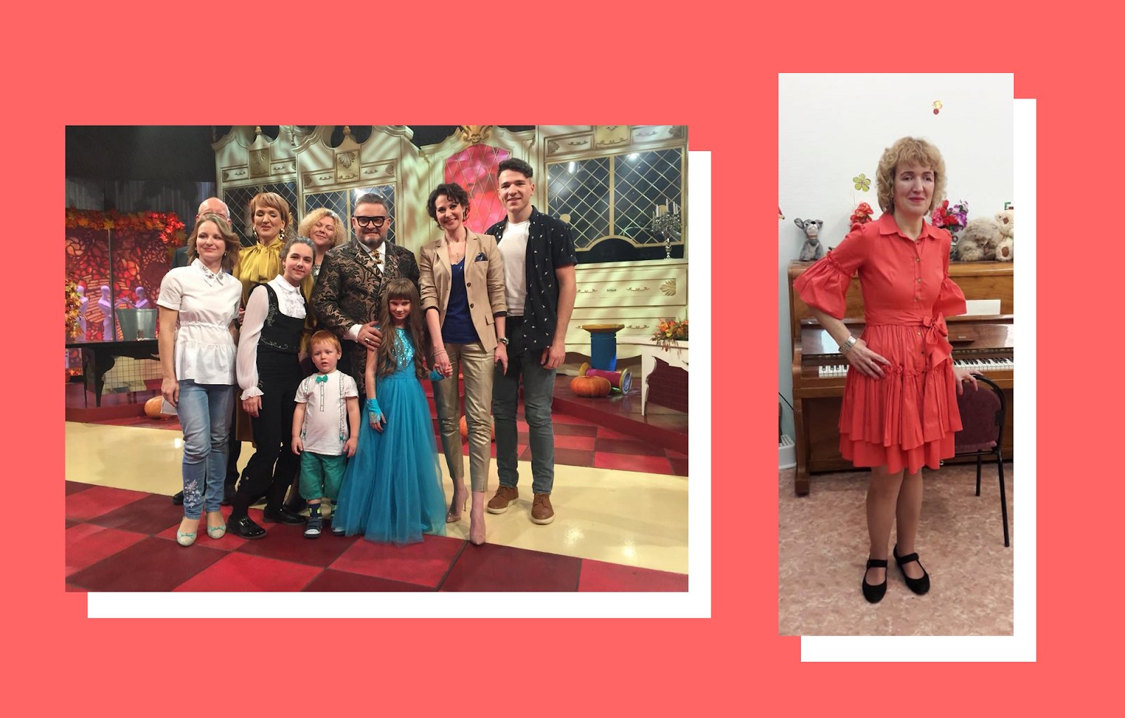 Тифлокомментарий: цветной коллаж из двух фотографий на розовом фоне. На фото слева позирует группа людей: семеро взрослых и трое детей. Это участники и ведущие телешоу «Модный приговор». Среди них Наталья Белова-Давыдова в желтом легком платье. На фото справа Наталья стоит в комнате, положив правую руку на бедро, и улыбается. У нее светлые кудри до плеч и челка, она одета в приталенное алое платье по колено с оборками на юбке и пышными рукавами-воланами. На ногах черные туфли на невысоком каблуке. Позади Натальи открытое фортепиано с мягкими игрушками на нем.