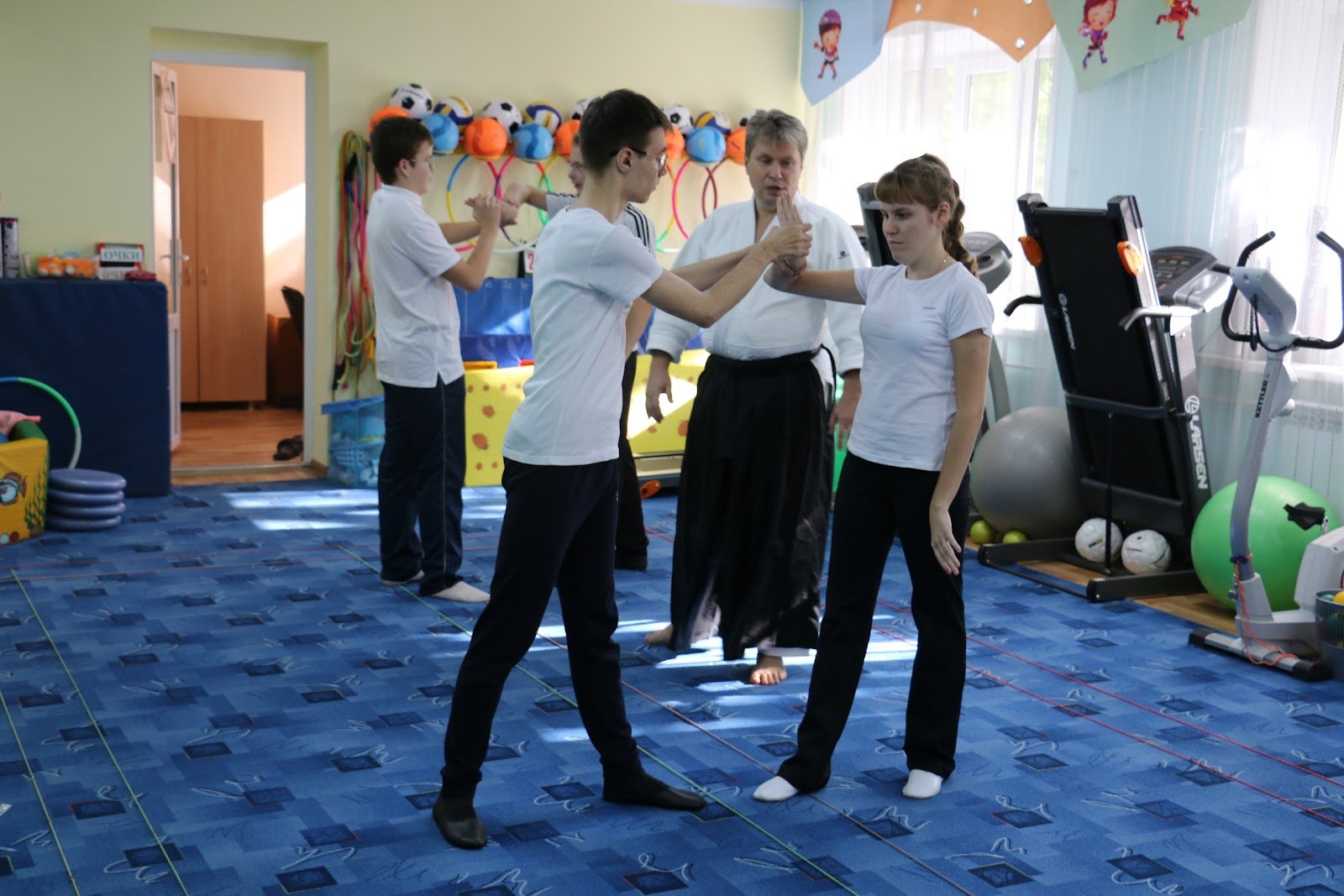 Тифлокомментарий: цветная фотография. Светлый зал с желтыми стенами и синим ковром. В зале попарно стоят четверо подростков в белых футболках и черных тренировочных брюках. Они стоят напротив друг друга, ноги на ширине плеч, и тренируют захват руки. Один из учеников двумя руками выворачивает запястье другому. Рядом с ними крупный седой мужчина в черно-белом кимоно. К стенам придвинуты тренажеры, на полу лежат большие мячи, на стене висят разноцветные обручи.