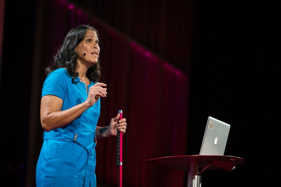 Тифлокомментарий: Цветная фотография. На сцене на фоне темно-бордового занавеса стоит темноволосая латиноамериканка в голубом платье с коротким рукавом и поясом на талии. В правой руке она держит красную трость, левую согнула в локте. Она смотрит прямо и наверх и говорит. На щеке закреплен черный петличный микрофон. Рядом с ней стоит круглый столик на высокой стойке, на нем раскрытый «Макбук».