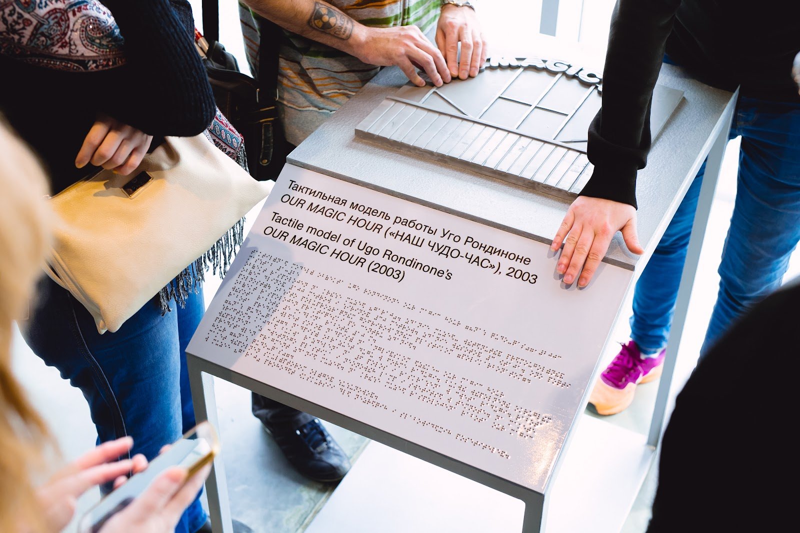 На фото: стойка с тактильной моделью произведения Уго Рондиноне «Наш чудо-час» и использованием шрифта Брайля в Музее «Гараж». 2017. Музей современного искусства «Гараж».