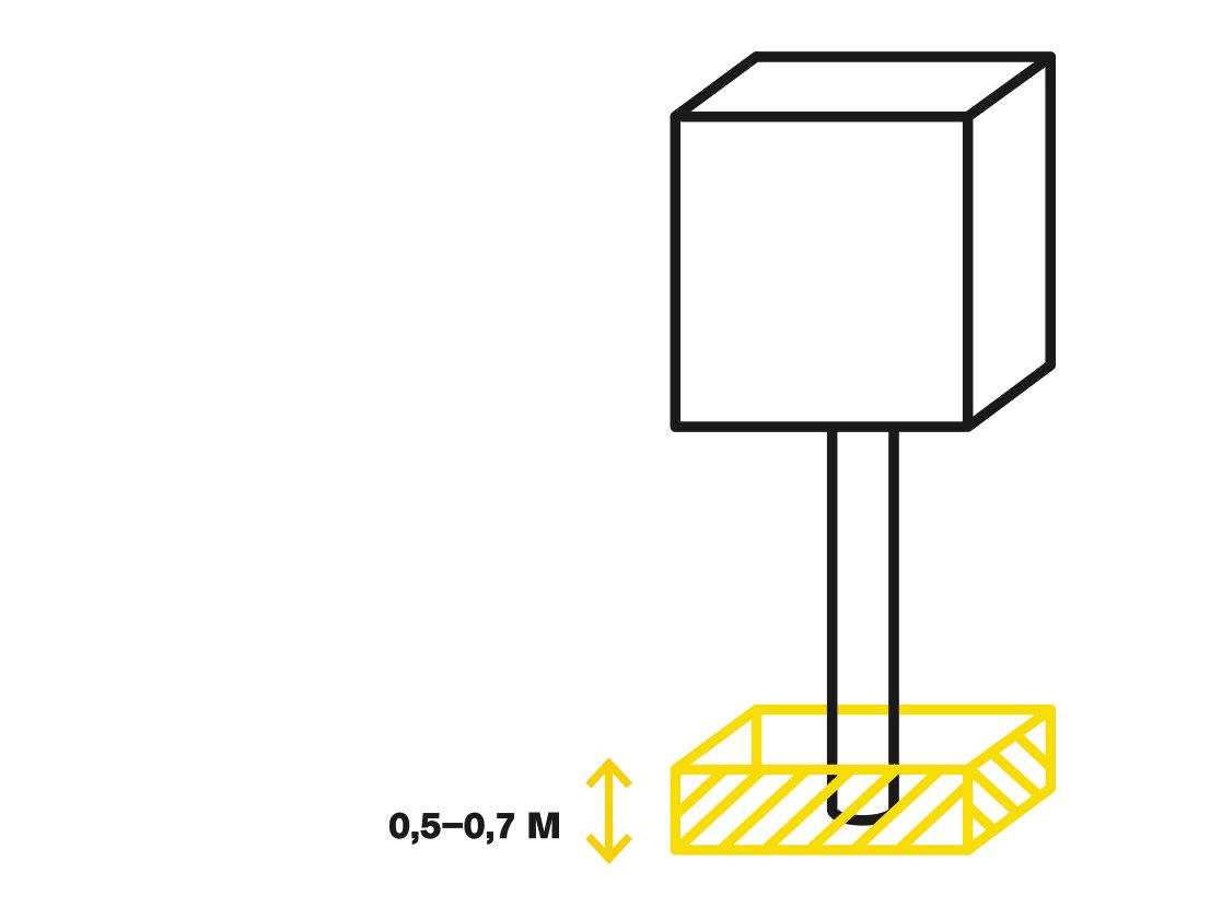 Тифлокомментарий: графическая иллюстрация. Черными линиями нарисован куб, стоящий на тонкой опоре - шесте. Внизу вокруг шеста желтыми линиями обозначен бордюр. Слева от него обозначение высоты бордюра и надпись: «0,5-0,7 м».
