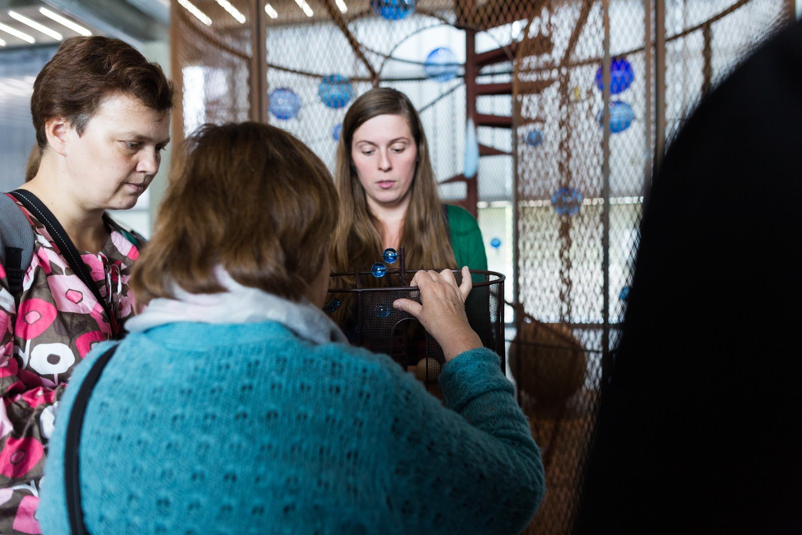 Тифлокомментарий: цветная фотография. Экскурсия по выставке Луиз Буржуа в музее «Гараж». Экскурсанты осматривают тактильную модель скульптуры. Модель представляет собой черную металлическую цилиндрическую клетку без крыши. Часть цилиндра имеет решетчатые стенки, в которых есть арочные проемы. В центре цилиндра винтовая лестница, а вокруг нее на разной высоте установлены стеклянные шарики синего цвета. Позади группы людей находится оригинал скульптуры высотой в два человеческих роста.