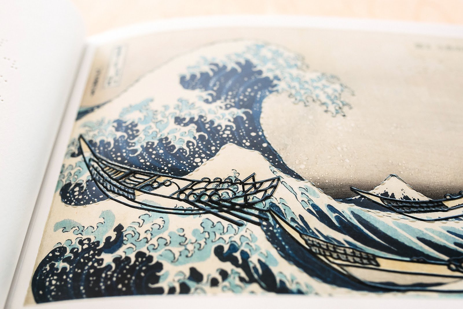 На фото: примеры иллюстраций к книге Tactile HOKUSAI. Галерея ТОМ, Токио. Музей современного искусства «Гараж»