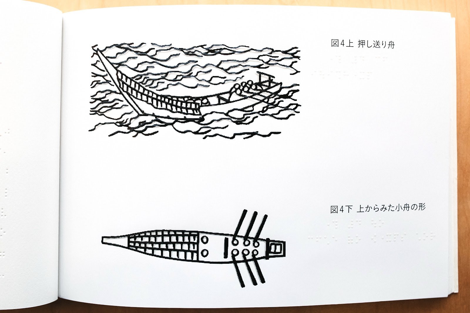 Второе изображение - фотография листа из альбома с рельефной графикой. На листе расположены друг над другом два черно-белых рисунка, справа от каждого рисунка комментарий из строчки японских иероглифов и двух строчек текста шрифтом Брайля. На рисунке сверху — длинная лодка с высоким заостренным носом плывет по волнам. На корме лодки сидят в два ряда шесть человек и гребут, в центре лодки сидят еще двое. На рисунке внизу — схематичный вид лодки сверху. Форма лодки напоминает узкий длинный лепесток.