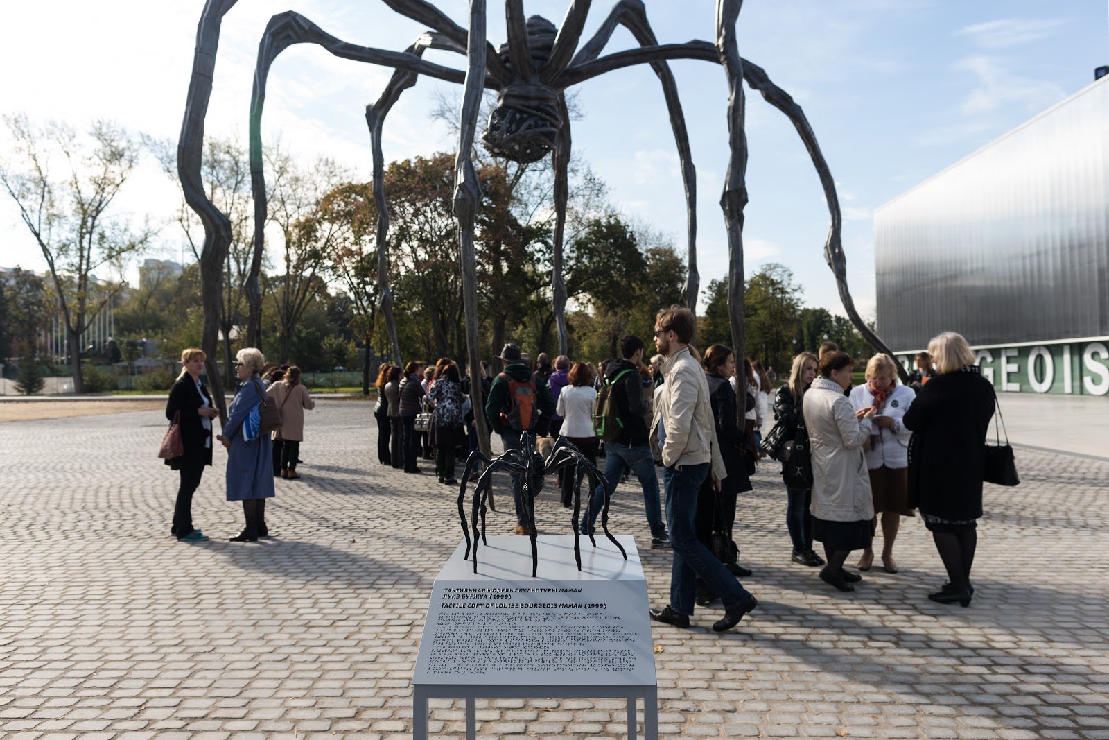 На фото: стойка с тактильной моделью перед произведением Луиз Буржуа Maman, размещенным на площади Искусств перед Музеем «Гараж». 2015. Авторы: Ольга и Михаил Шу. Музей современного искусства «Гараж».