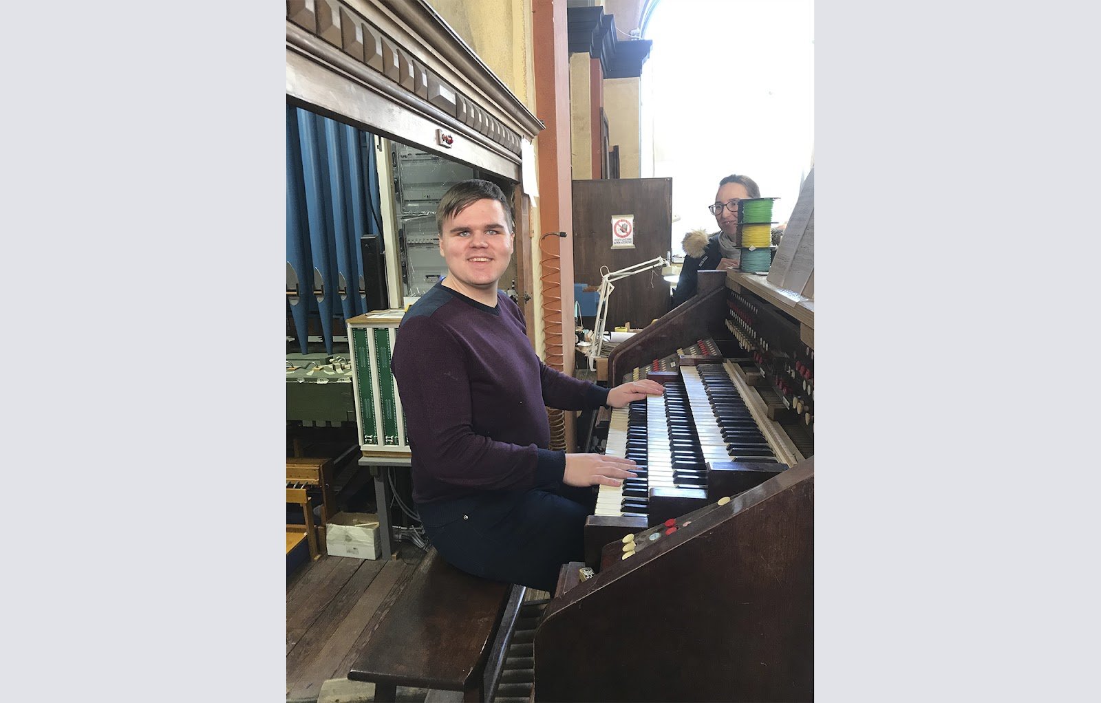 Тифлокомментарий: цветная фотография. За органом с тремя клавиатурами сидит положив руки на клавиши молодой человек и с улыбкой смотрит в камеру. Это Владимир Васкевич. Он одет в черные джинсы и фиолетовый джемпер, у него короткие русые волосы с косой челкой. Рядом у органа стоит девушка в очках.