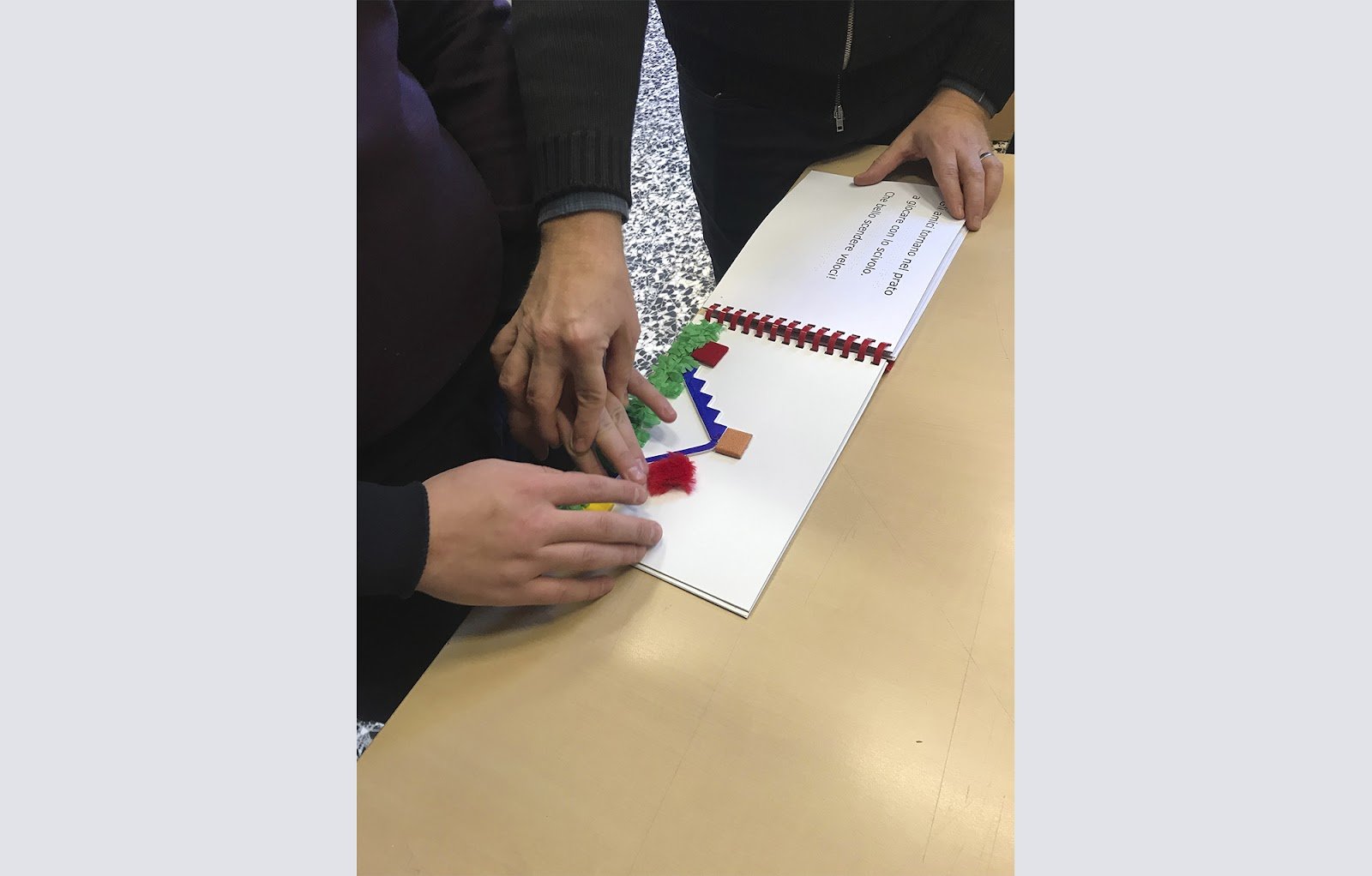 Тифлокомментарий: цветная фотография. На столе лежит небольшой альбом с крупным текстом на одной странице и тактильными абстрактными фигурами на другой: внизу приклеена зеленая полоска, на ней красный квадрат и синий треугольник со стороной-лесенкой и т.д. За столом стоят два человека, один из них трогает фигуры обеими руками, второй направляет его пальцы.