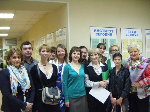 Тифлокомментарий: цветная фотография. Групповое фото в коридоре института. 11 женщин и мужчина разных возрастов стоят в два ряда. Одна из них держит букет. Все улыбаются. В первом ряду стоит Людмила Николаевна Ростомашвили. У нее в руках бумаги и папка. Позади группы на стенах висят информационные стенды.