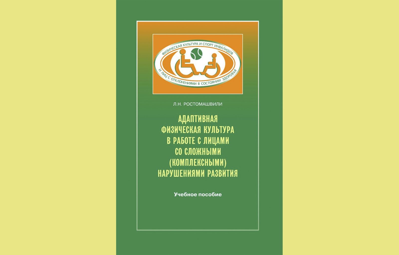 Тифлокомментарий: цветная фотография. На желтом фоне обложка учебного пособия зеленого цвета. В центре название: «Адаптивная физическая культура в работе с лицами со сложными (комплексными) нарушениями развития».Выше фамилия и инициалы автора: «Л.Н. Ростомашвили» - и логотип: в оранжевом прямоугольнике белый овал, в котором схематично, лицом друг к другу, изображены взрослый и ребенок в инвалидных креслах, между ними зеленый баскетбольный мяч. Вокруг логотипа надпись: «Физическая культура и спорт инвалидов и лиц с отклонениями в состоянии здоровья».