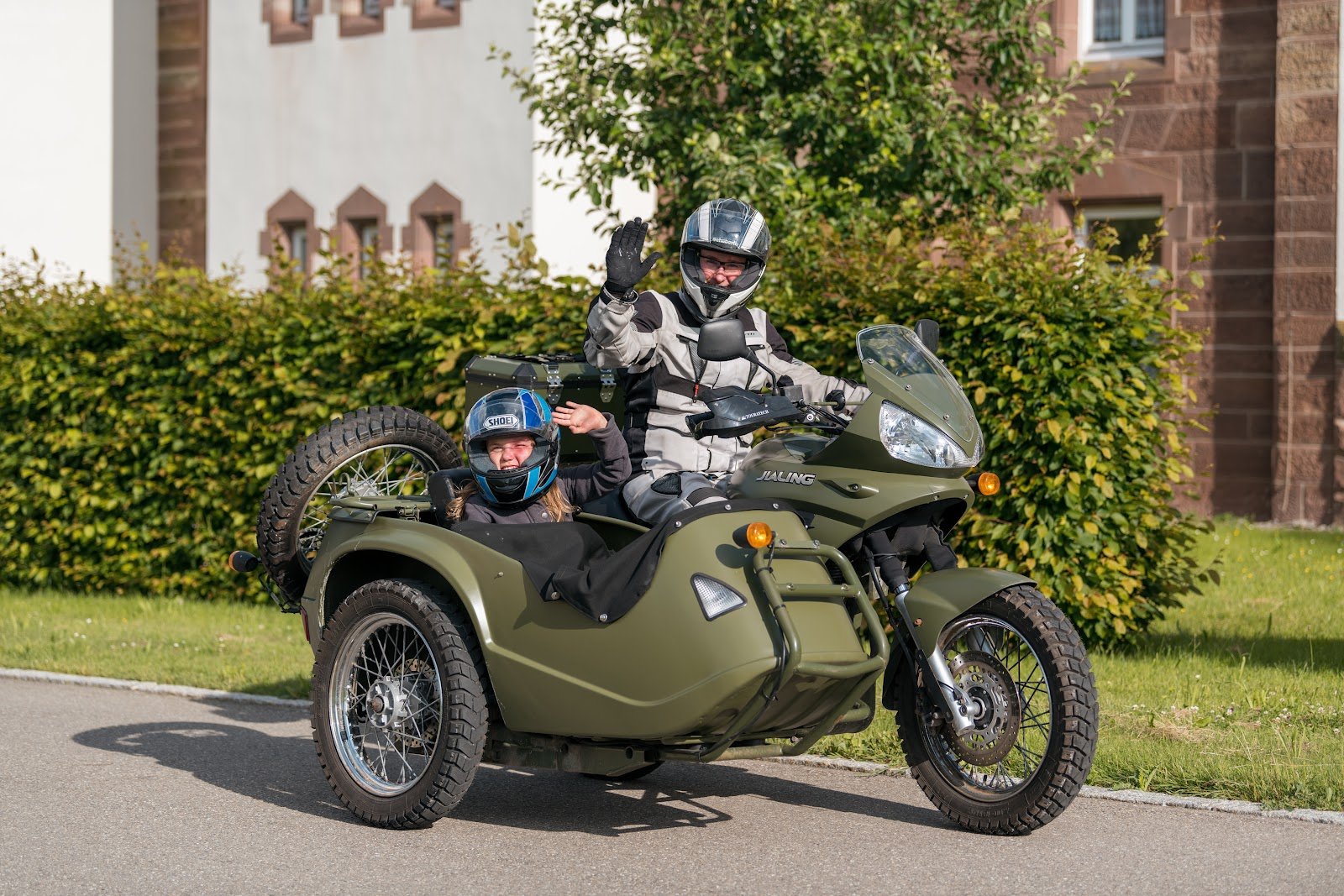 Тифлокомментарий: цветная фотография. Летний ясный день. На улице на фоне кустарников и кирпичного здания стоит темно-зеленый мотоцикл с коляской. На мотоцикле сидит молодая женщина в очках, шлеме и мотоциклетной серой форме. Это Лиза Беллер. В коляске сидит девочка в шлеме. Обе машут в камеру.