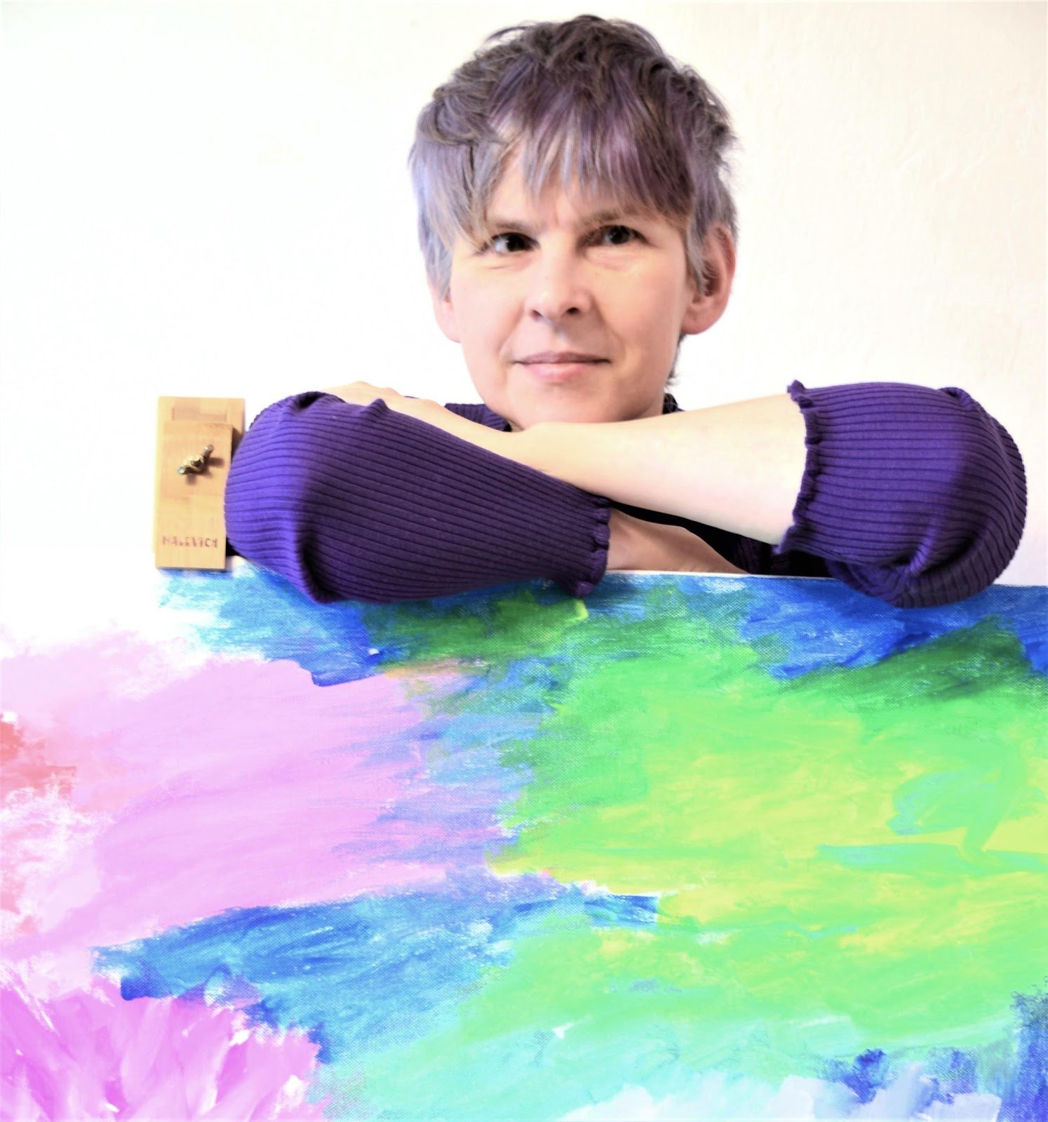 Тифлокомментарий: цветная фотография. Ирина Поволоцкая стоит в мастерской, опершись на свою картину. У Ирины короткие бледно-фиолетовые волосы с челкой, темные глаза. Она улыбается. Картина — это абстрактное полотно из крупных пятен, написанных крупными мазками розового, голубого и ярко-зеленого оттенков.