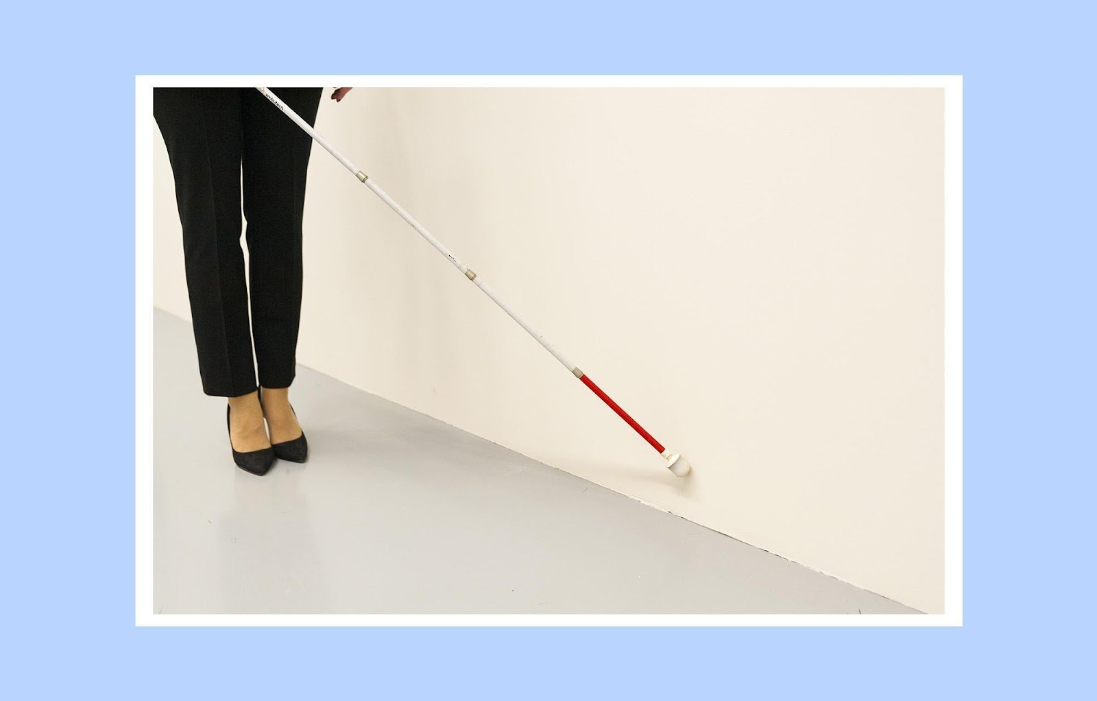 Тифлокомментарий: на голубом фоне цветная фотография в белой рамке. К белой стене на небольшом расстоянии от пола прикасается белая трость с красным нижним сегментом и цилиндрическим наконечником. Рядом на светлом полу женские ноги в черных брюках и элегантных лодочках на каблуках.
