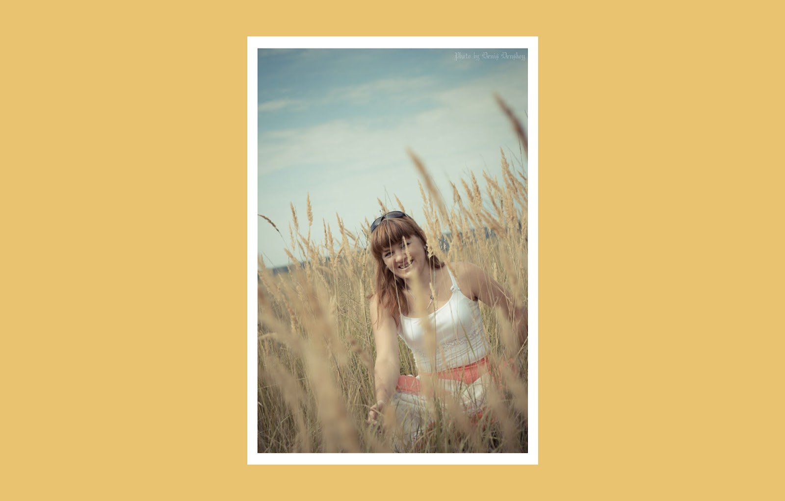 Тифлокомментарий: на желтом фоне цветная фотография в белой рамке. Вид немного снизу. Анастасия в том же наряде бежит по пшеничному полю, широко улыбается. Юбка разлетается в разные стороны. Золотистые колосья поднимаются выше ее головы, макушками уходят в голубое небо с небольшими облаками.