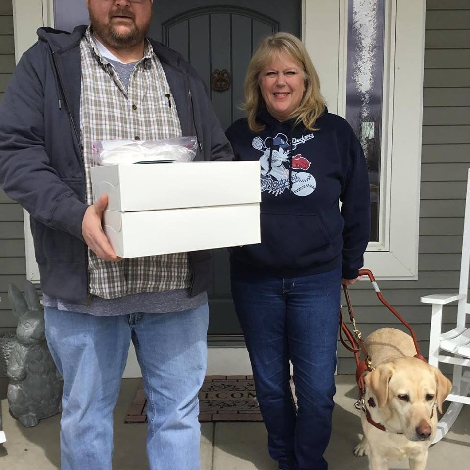 Тифлокомментарий: цветная фотография. На пороге дома в солнечный ясный день стоят мужчина и женщина средних лет в повседневной одежде. Высокий крупный мужчина держит две белые картонные коробки, в которых обычно переносят выпечку. Блондинка рядом с ним широко улыбается в камеру и левой рукой придерживает за шлейку палевого лабрадора-проводника. У нее прямые волосы по плечи, неяркий макияж, глаза прищурены. На заднем плане массивная серая дверь, слева от нее серая садовая скульптура в виде зайца с коробом, справа – белое кресло-качалка.