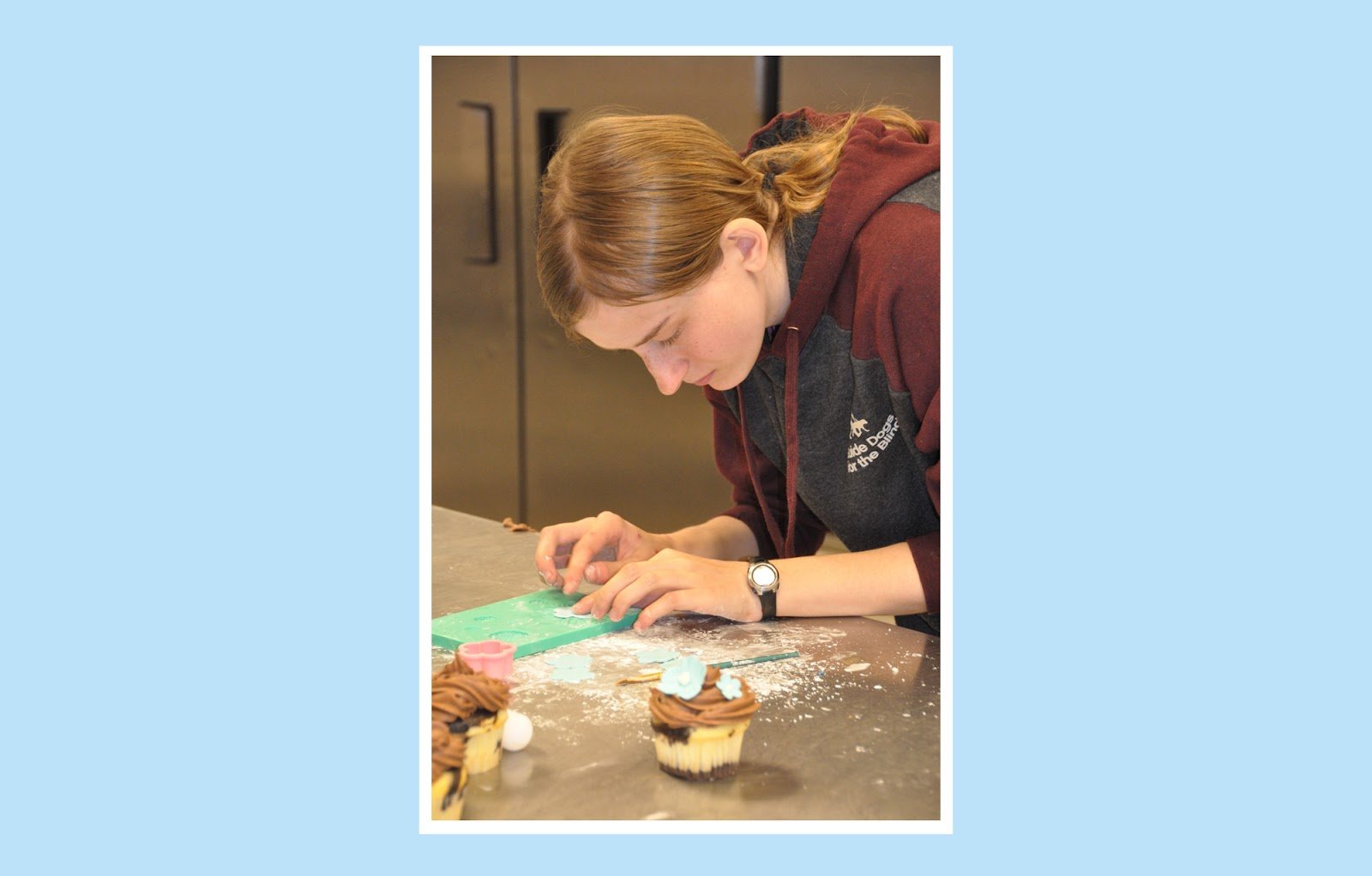 Тифлокомментарий: цветная вертикальная фотография в белой рамке на светло-голубом фоне. Девушка вырезает украшения для капкейков из сладкой мастики, низко склонившись над столом. У нее сосредоточенное выражение лица, русые волосы убраны в низкий хвост. Она одета в серо-бордовое худи, на запястье часы с черным ремешком. На столе, посыпанном сахарной пудрой, лежат капкейки с шоколадным кремом и сахарными голубыми цветами, лопатка и формочка в виде цветка.
