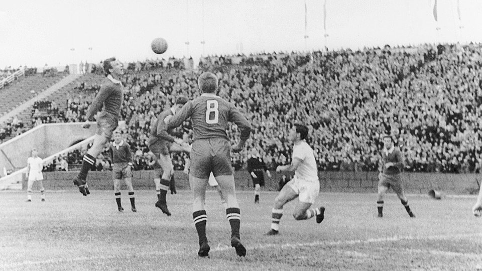 Тифлокомментарий: старая черно-белая фотография футбольного матча. Игроки одной команды в темных шортах и футболках с длинным рукавом, другой – в светлых футболках с коротким рукавом и шортах. На переднем плане спиной к нам футболист в темном с цифрой «восемь» на спине. Он собран и напряжен. Его одноклубник слева высоко подпрыгнул и вытянулся в струнку, отбивая мяч головой. Игрок справа в белой форме бежит, пытаясь перехватить мяч. Другие футболисты бегут и наблюдают за игрой. Трибуны заполнены болельщиками.