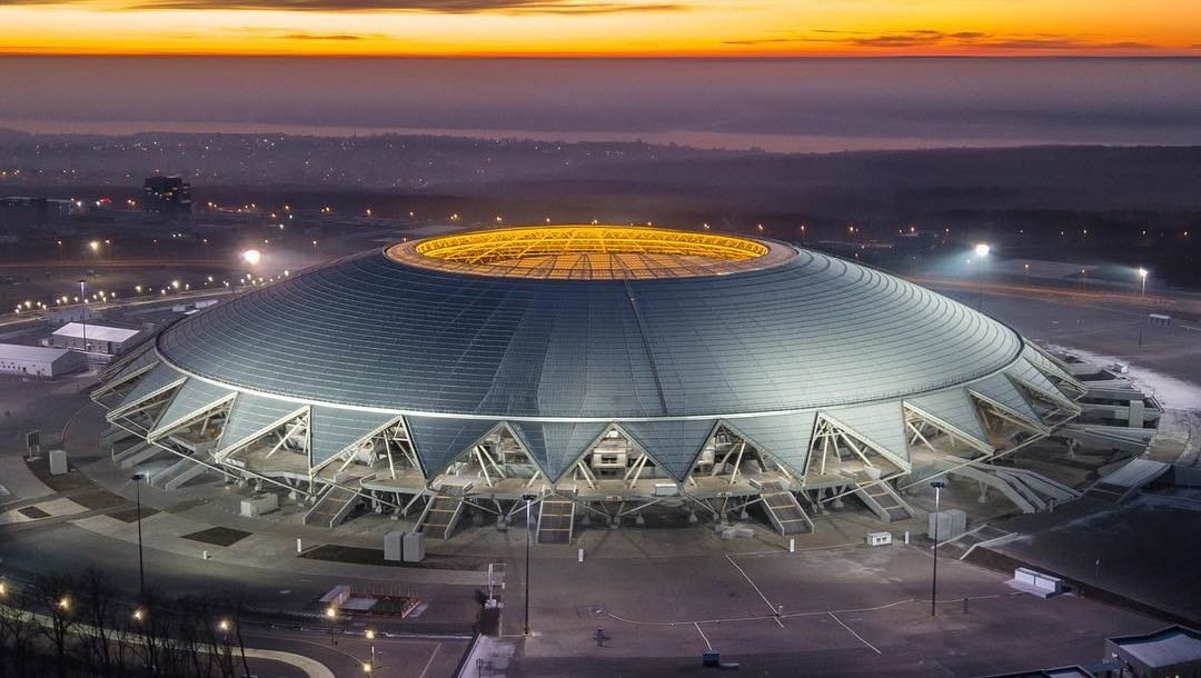 Тифлокомментарий: цветная фотография. Крытый стадион футбольного клуба «Крылья Советов» «Космос-Арена» на фоне заката. Сферическое сооружение стального цвета напоминает летающую тарелку. Стеклянная верхушка плоского купола светится изнутри. Внизу он заканчивается острыми треугольными лепестками. Со всех сторон здание освещают прожекторы. На заднем плане огни города в лиловой дымке, над ней огненный закат.