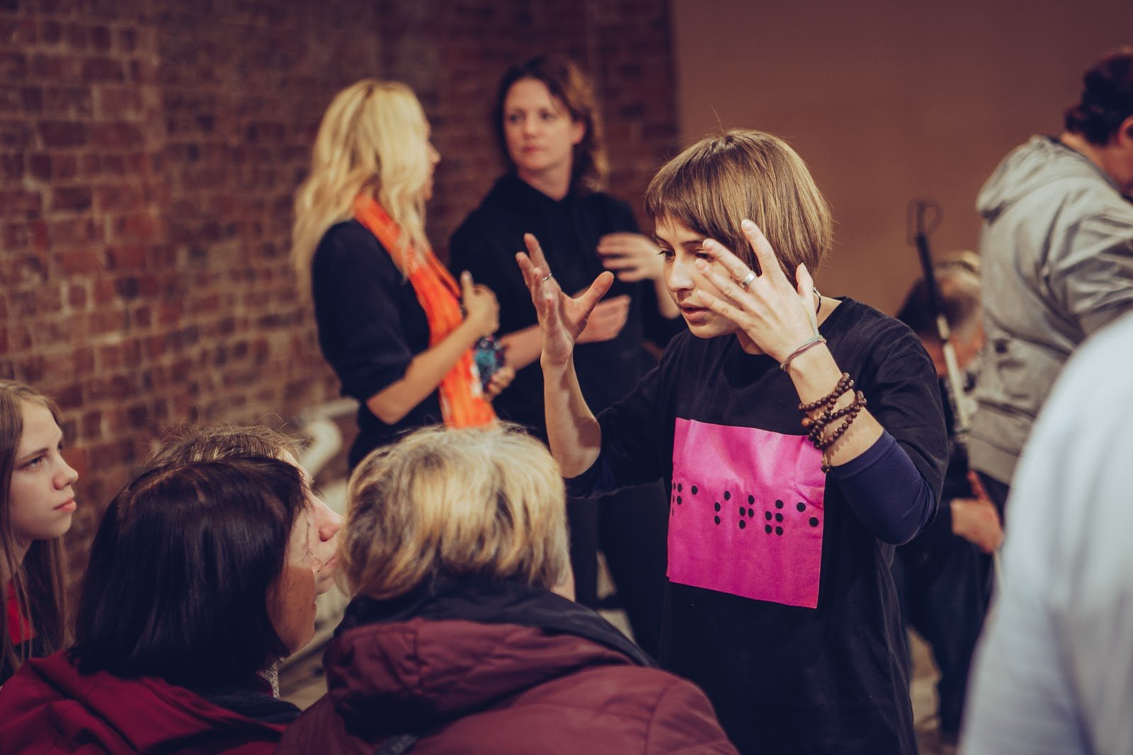 Тифлокомментарий: цветная фотография. В том же помещении люди общаются. Девушка с каре что-то увлеченно рассказывает женщинам, сидящим перед ней. Она одета в черную футболку с рукавами, на груди большой розовый квадрат со словом «счастье» на плоском шрифте Брайля. Девушка жестикулирует, подняв руки к лицу и раскрыв ладони. На левом запястье у нее связка деревянных четок. На заднем плане сидят люди с белыми тростями. Рядом беседуют две женщины.