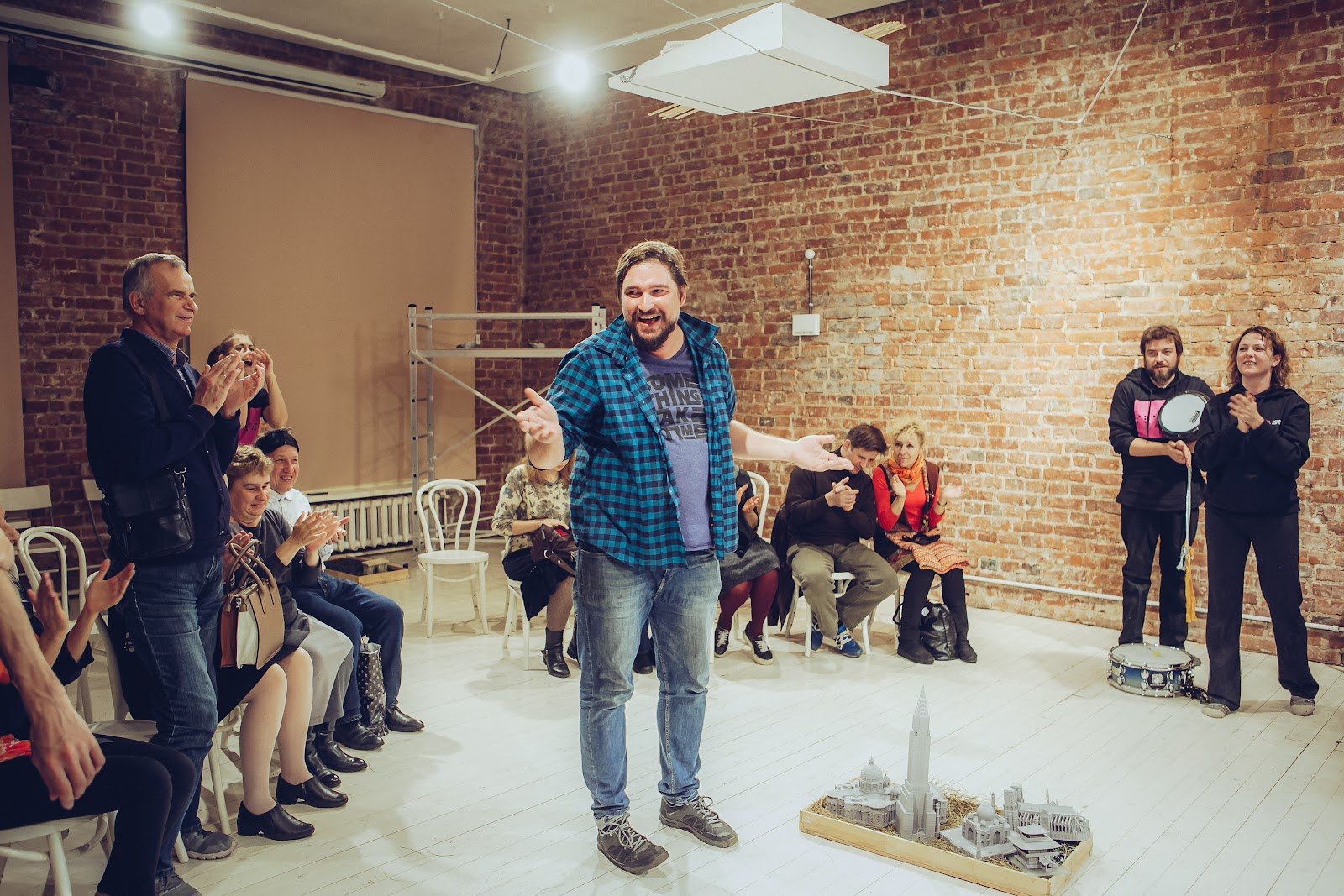 Тифлокомментарий: цветная фотография. В центре помещения с кирпичными стенами стоит мужчина и смеется. Он повернул голову влево, левую руку выставил вперед с раскрытой ладонью, а правую руку протянул по направлению взгляда, будто для рукопожатия. Он одет в джинсы, футболку и клетчатую рубашку. У него широкое лицо с крупными чертами лица, короткие темные волосы и борода с усами. Рядом с ним на полу стоит низкая коробка с серыми тактильными макетами архитектурных достопримечательностей. Позади мужчины на белых стульях сидят зрители, с другой стороны стоит пара: мужчина держит под мышкой барабан, еще один барабан лежит у его ног. Все люди в зале аплодируют мужчине в центре, одна из женщин приставила ладони ко рту и кричит.