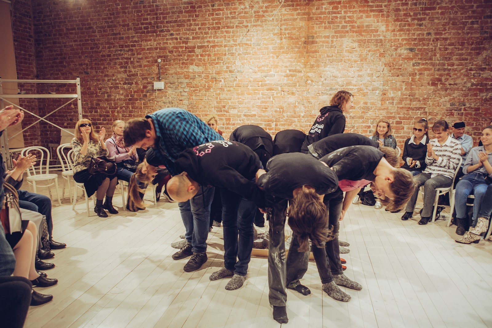 Тифлокомментарий: в том же помещении в центре группа людей. Они встали в круг спиной друг к другу, и низко кланяются во все стороны, вокруг них сидят на белых стульях и аплодируют зрители. На ногах почти у всех участников поклона толстые шерстяные носки и джинсы, сверху — черные футболки и толстовки.