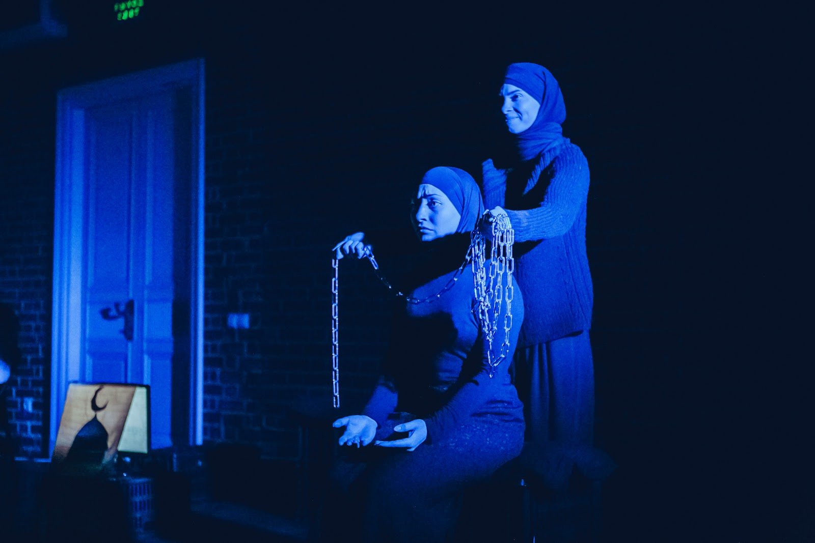 Тифлокомментарий: цветная фотография. Комната с кирпичными стенами и высокими белыми дверями освещена ярко-синим светом. На сцене две женщины в длинных черных юбках, кофтах и черных хиджабах. Одна из них сидит на скамье, положив руки на колени ладонями вверх. Она обеспокоенно смотрит вперед, сдвинув брови. За ее спиной стоит вторая женщина, она улыбается и держит в руках длинную цепь, будто примеряя ее к шее сидящей женщины. Справа на полу на пластиковом ящике светится картинка с куполом мечети.